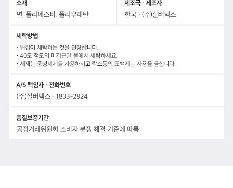 | 제조국 | 상품 상세페이지 참조 | 취급시 주의사항 | 상품 상세페이지 참조 |