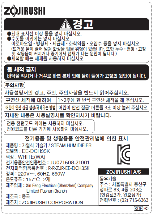 | 품명 및 모델명 | 가열식 가습기 / EE-DCH35K | KC 인증정보 | JU071608-21001, R-R-ZJR-EE-DCH35K |