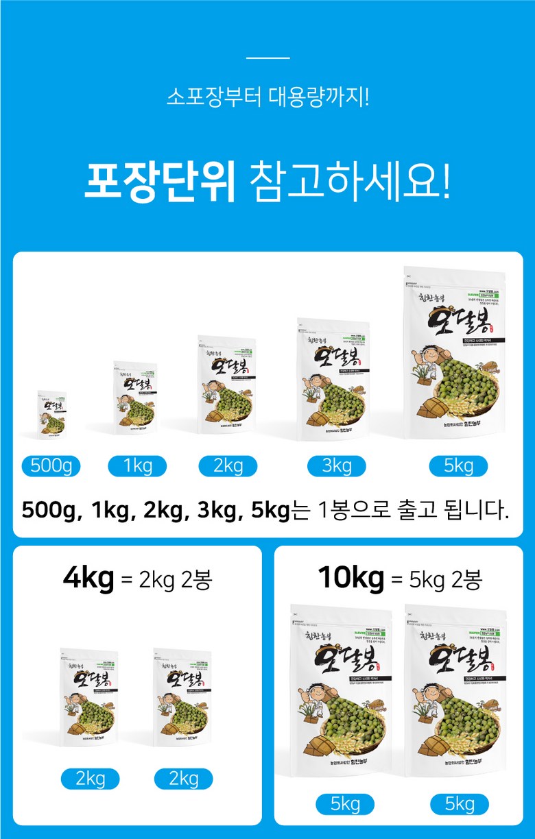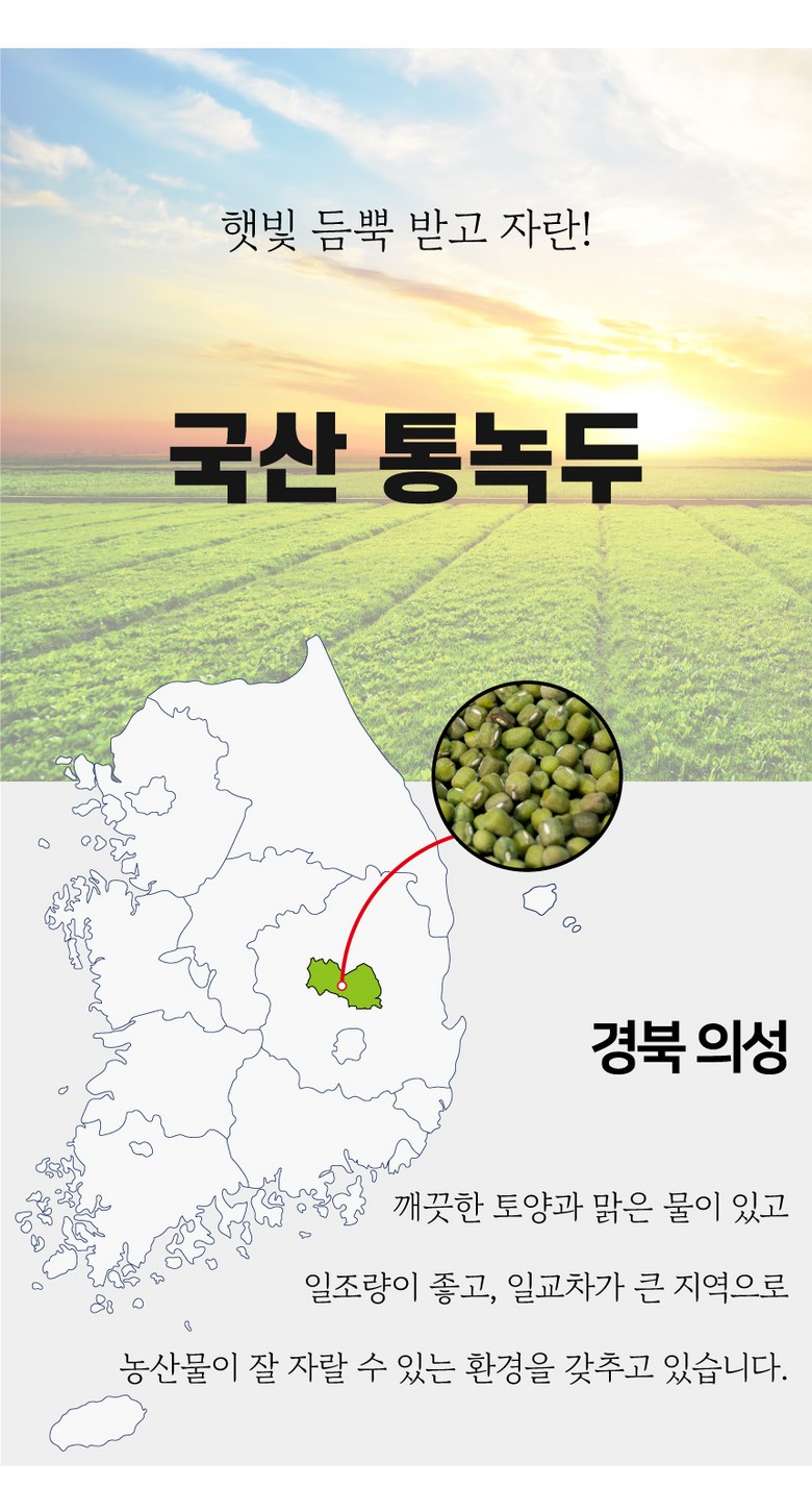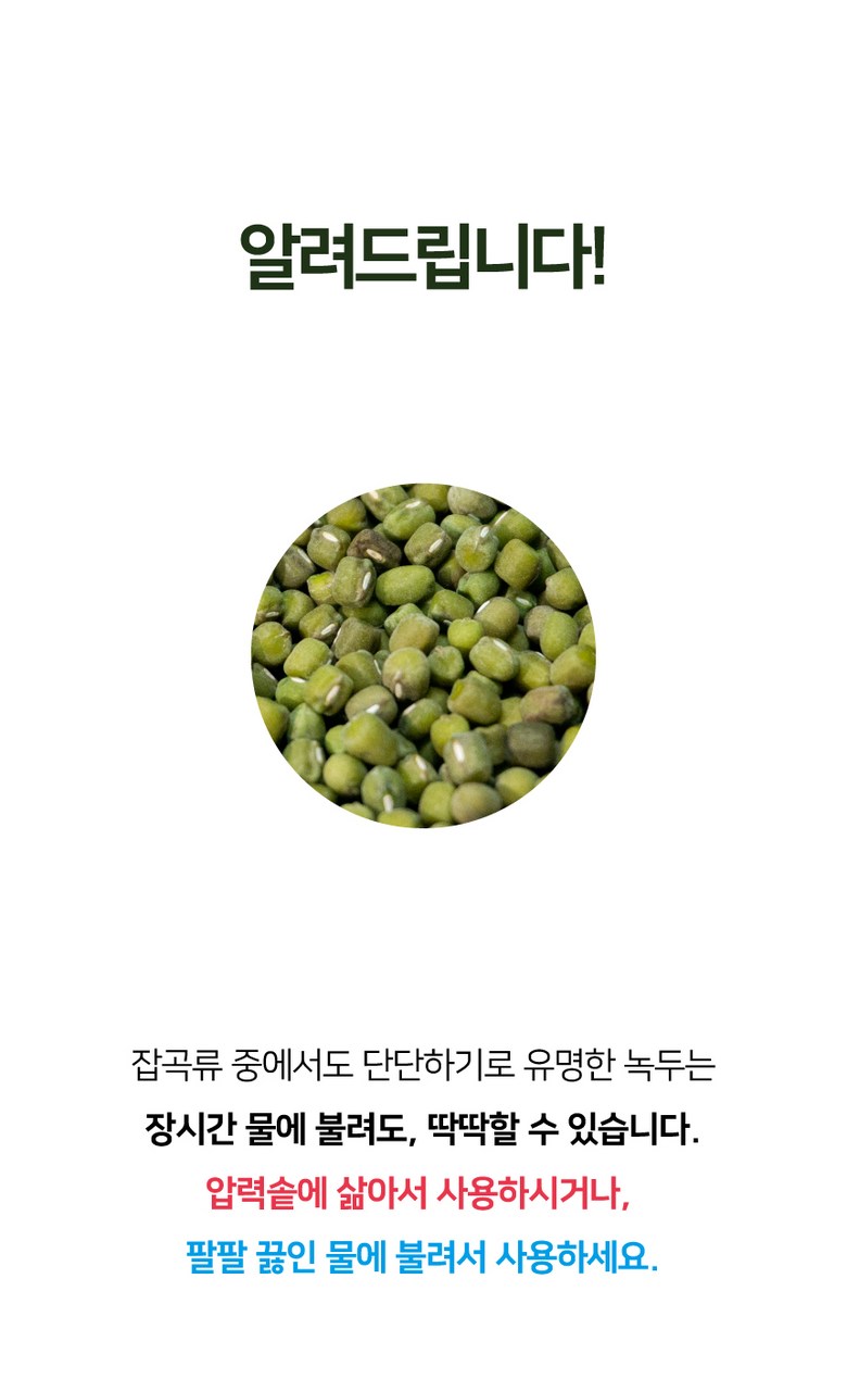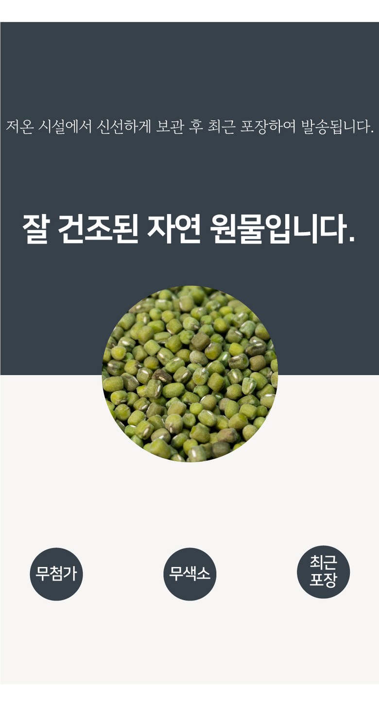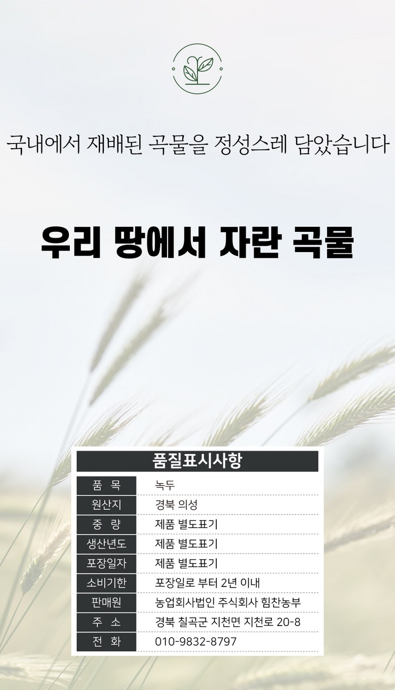 | 품목 또는 명칭 | 국산 녹두 | 포장단위별 내용물의 용량(중량),수량,크기 | 500g 1kg 2kg 3kg 4kg(2kg+2kg) 5kg 10kg(5kg+5kg) |