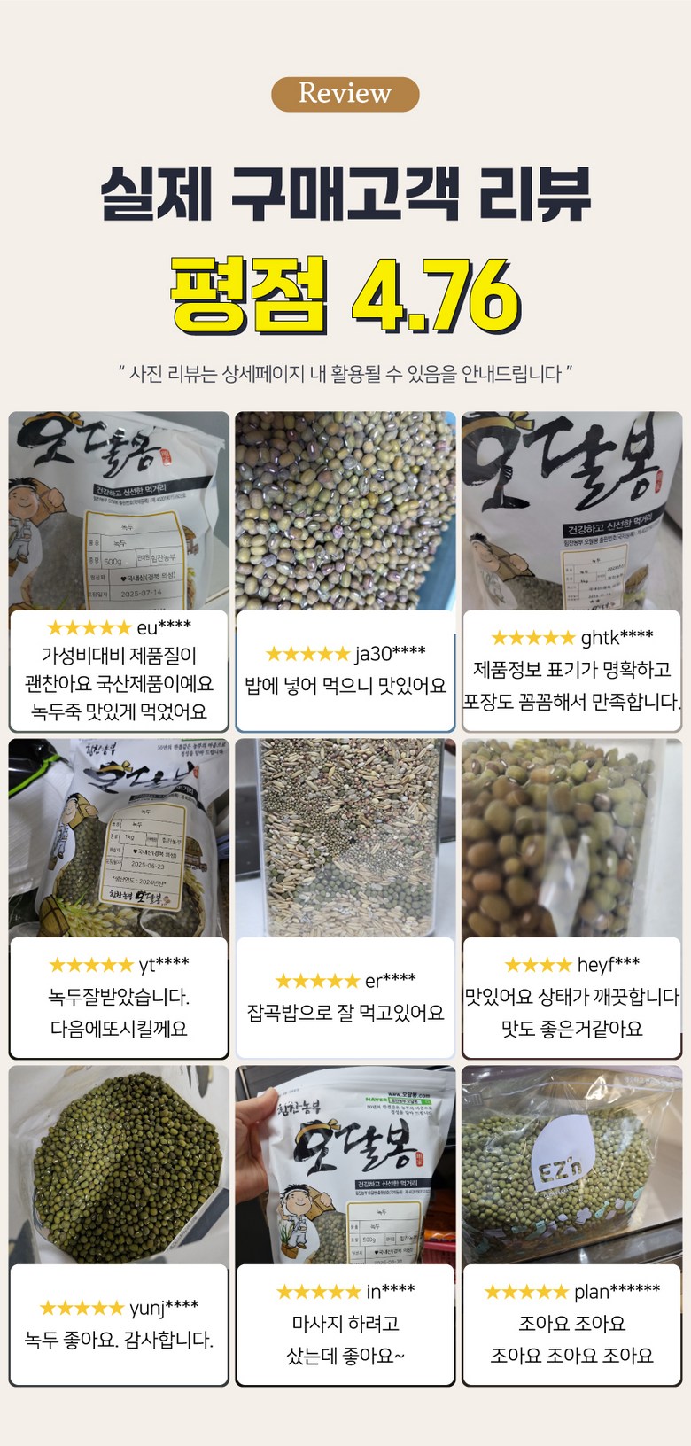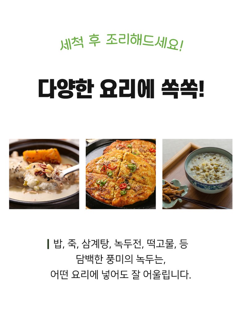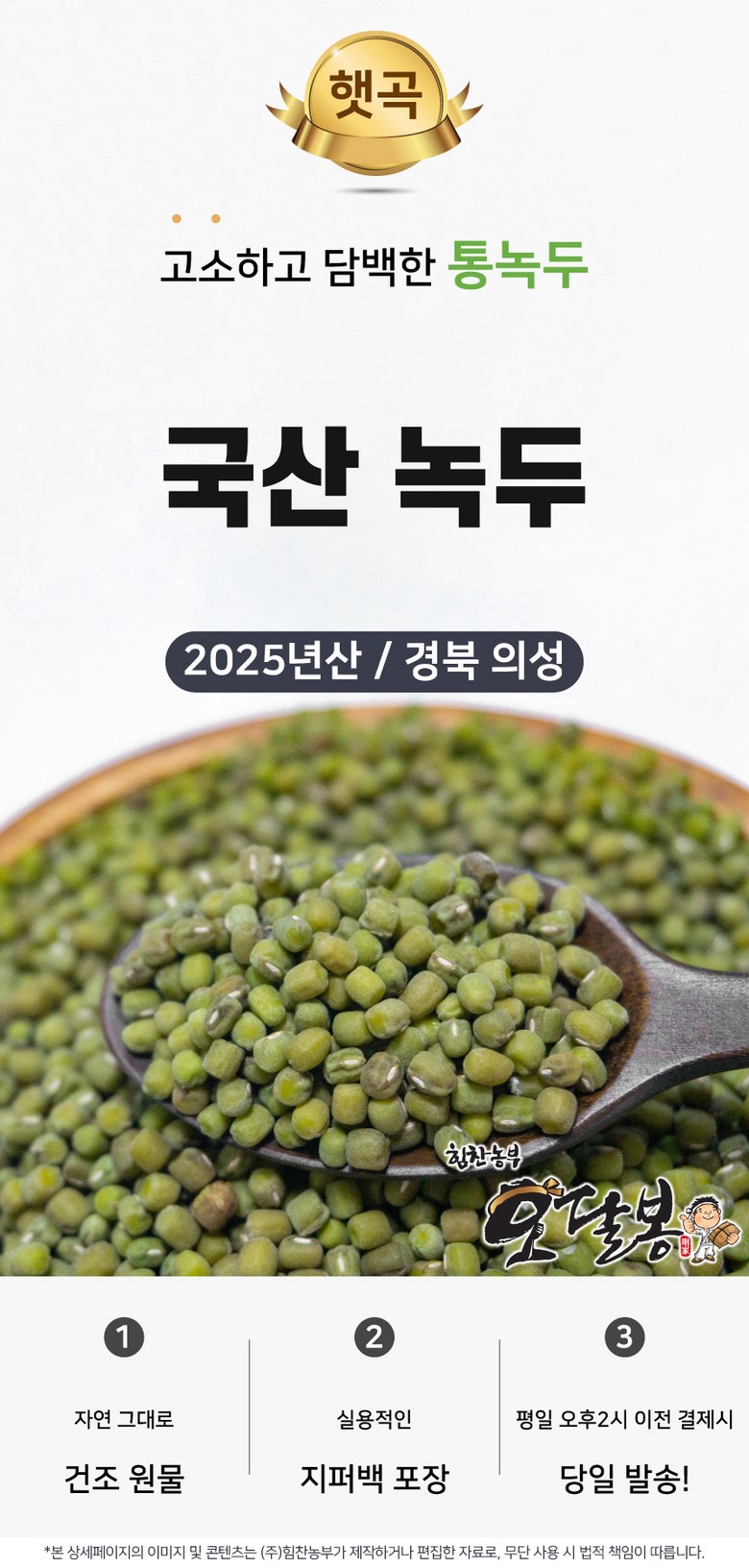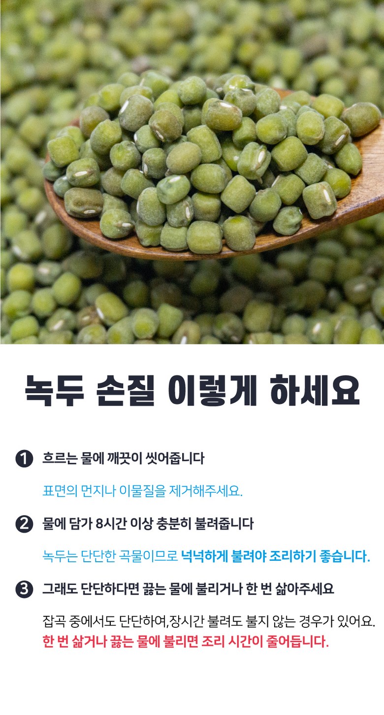 | 품목 또는 명칭 | 국산 녹두 | 포장단위별 내용물의 용량(중량),수량,크기 | 500g 1kg 2kg 3kg 4kg(2kg+2kg) 5kg 10kg(5kg+5kg) |