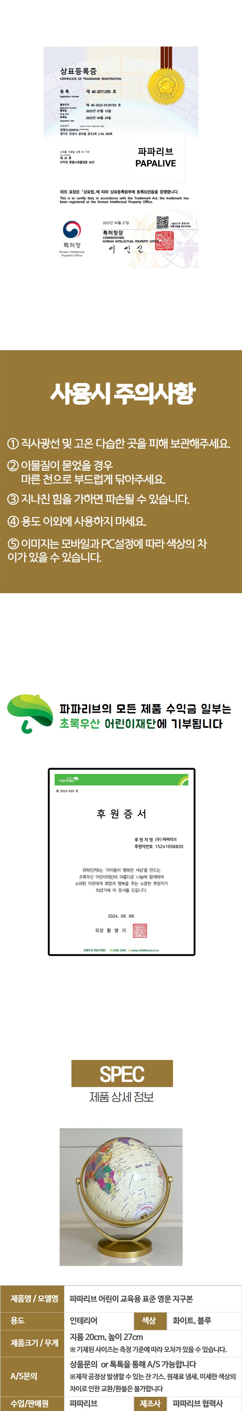 | 품명 및 모델명 | 파파리브 중형 영문 인테리어 학습용 어린이 지구본 블루, 파파리브 중형 영문 인테리어 학습용 어린이 지구본 화이트 | KC 인증정보 | 인증번호가 없는 "어린이 공급자 적합성 대상" 입니다. KC인증 마크는 상세페이지 내에 기재 |