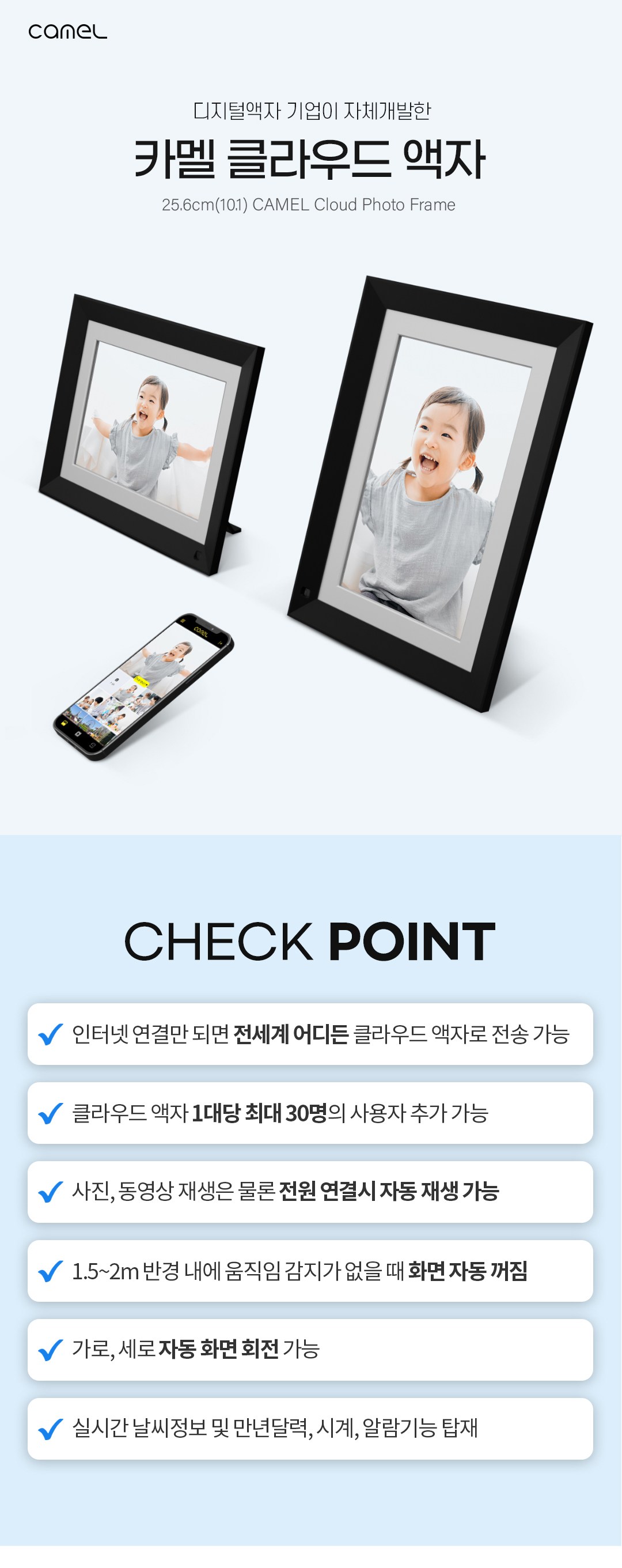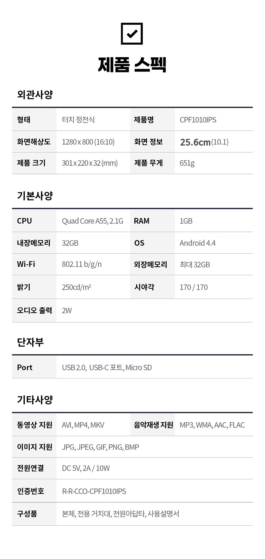 | 품명 및 모델명 | 카멜 터치 클라우드 디지털액자 / CPF1010IPS | KC 인증정보 | 본품 : R-R-CCO-CPF1010IPS, 전원아답타 :HU101026-19009B,R-R-KYa-KA1201A-050 |