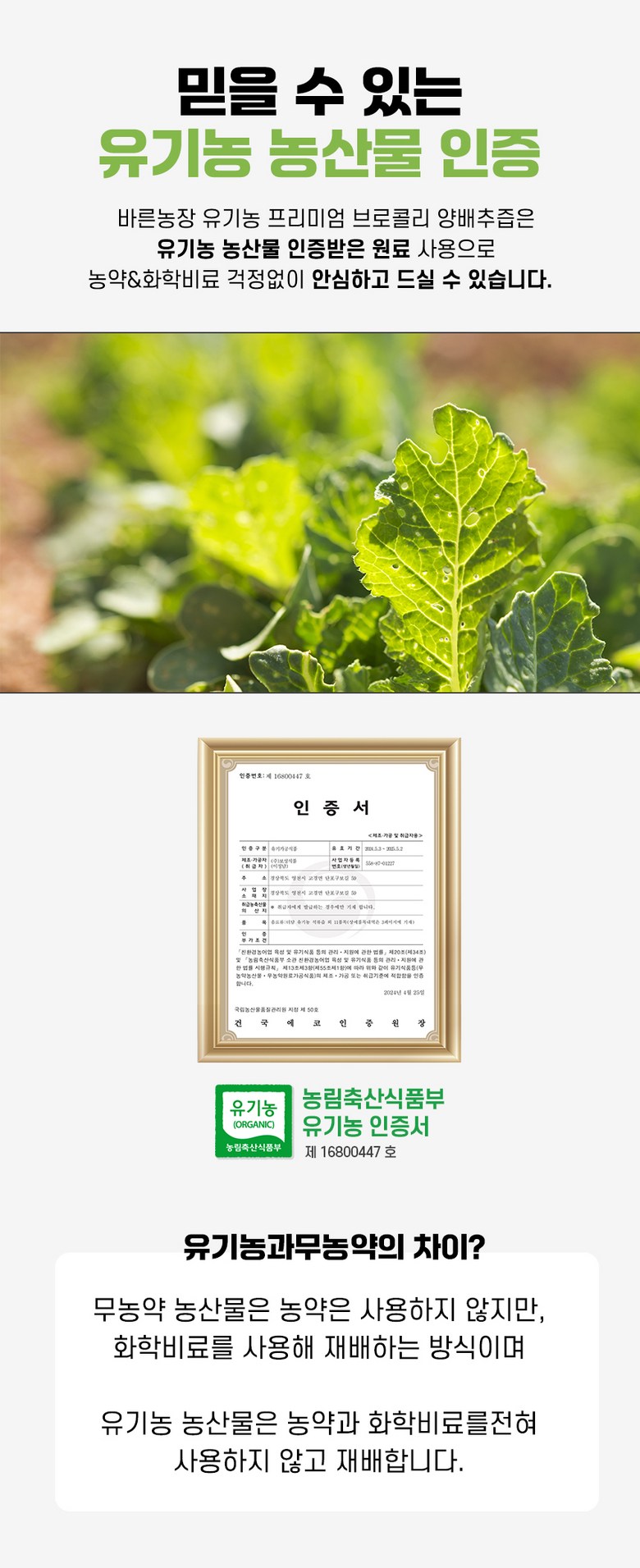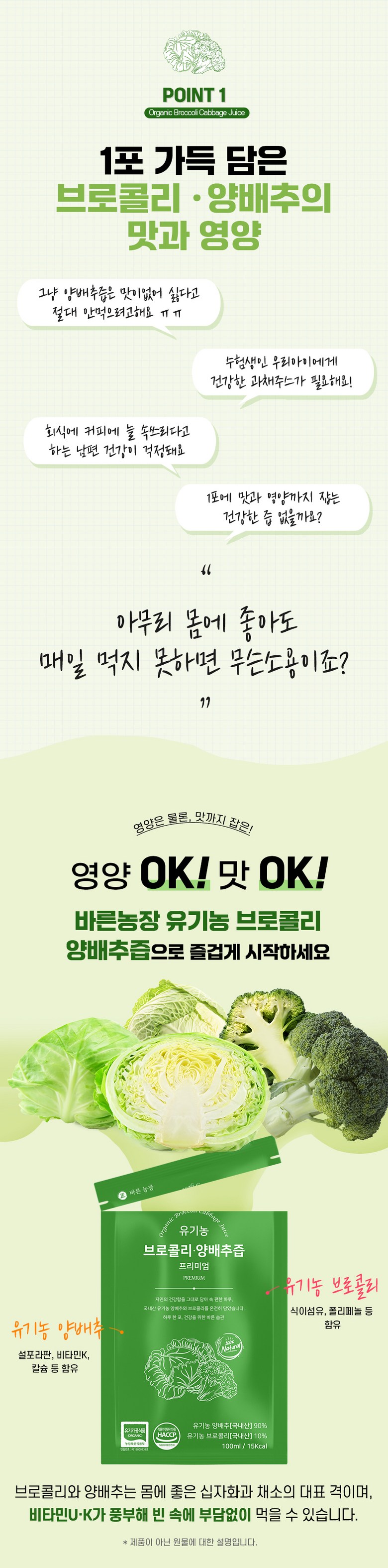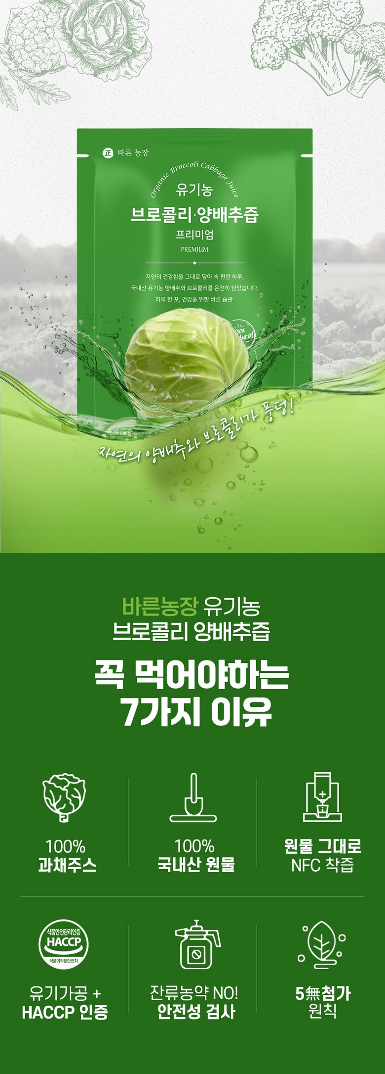 | 제품명 | 유기농 브로콜리 양배추즙 프리미엄 | 식품의 유형 | 과채주스 |