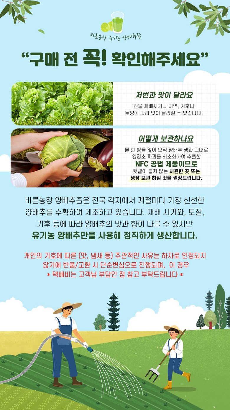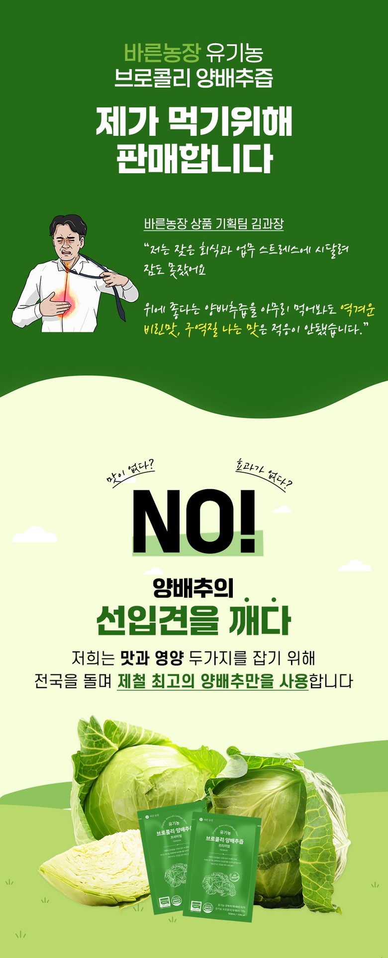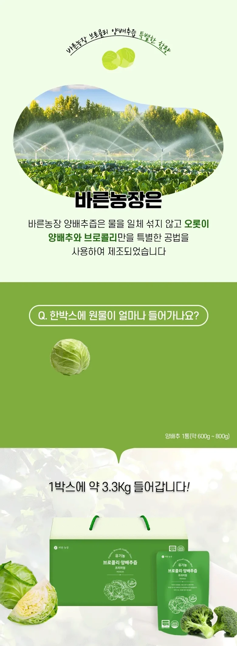 | 포장단위별 내용물의 용량(중량), 수량 | 1박스 30포 | 원재료명 및 함량 | 유기농 양배추 (국내산)90% 유기농 브로콜리 (국내산)10% |