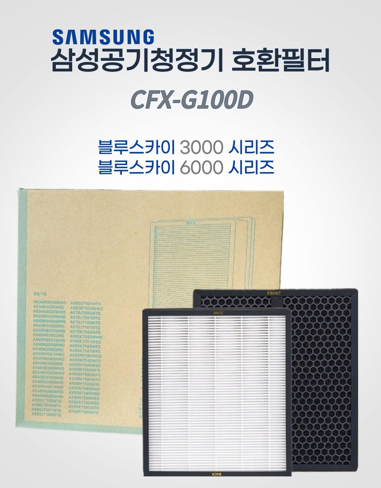 | 품명 및 모델명 | 삼성공기청정기필터 CFX-G100D | 인증/허가 사항 | 집진효율 인증 및 활성탄 효율 인증 완료유해물질 미검출 인증 완료 |