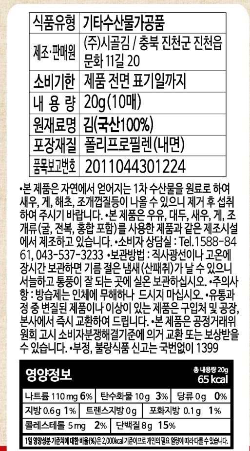 | 제품명 | 시골구운김밥김 | 식품의 유형 | 컨텐츠참조 |