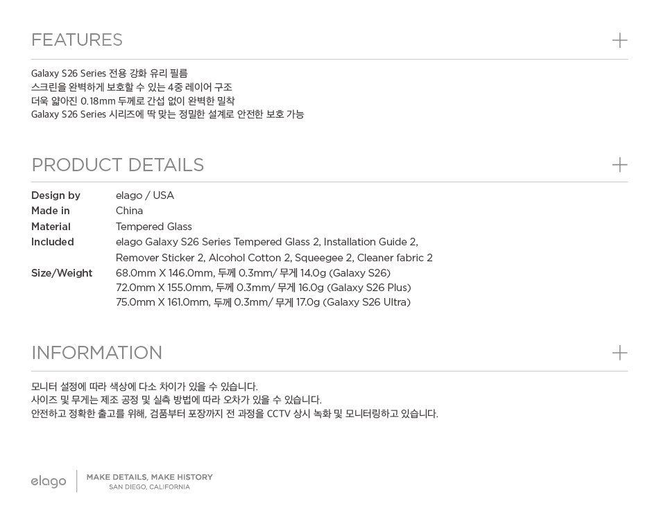 | 제조국(원산지) | 필름: 중국 / 알코올 솜: 컨텐츠참조 | 제조자(수입자) | 필름 : Kairui Opto-Elec Co., LTD / (주)엘라고 Ι 알코올 솜 : 컨텐츠참조 |