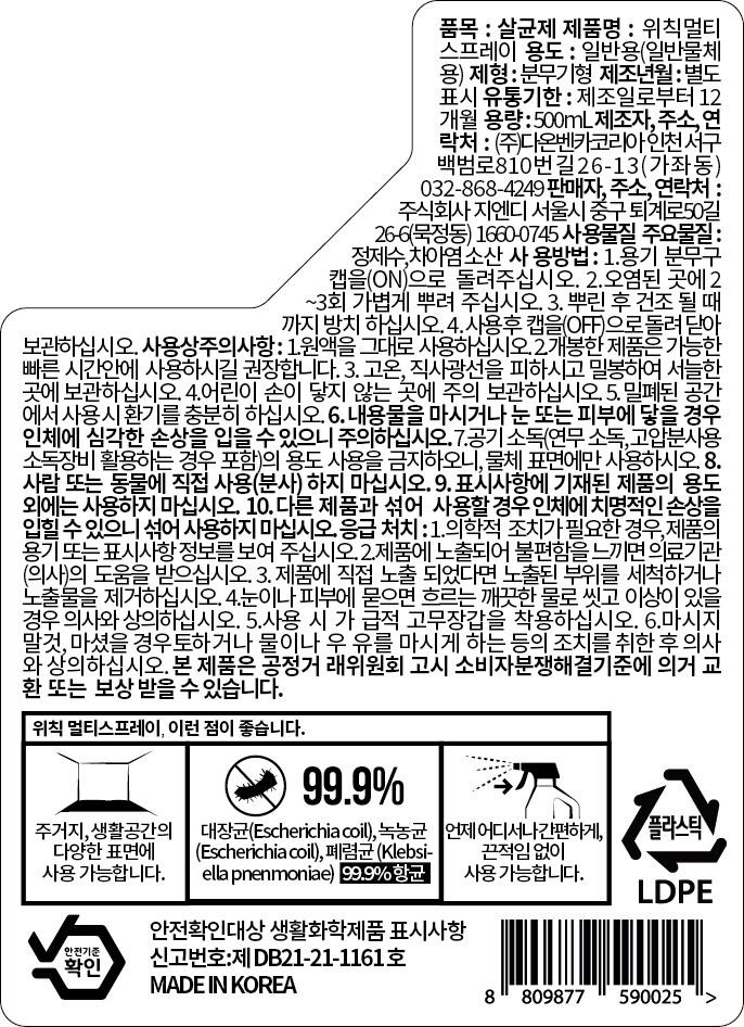 | 품목 및 제품명 | 살균제 / 위칙멀티스프레이 | 용도(표백제의 경우 계열을 함께표시) 및 제형 | 일반용(일반물체용) / 분무기형 |