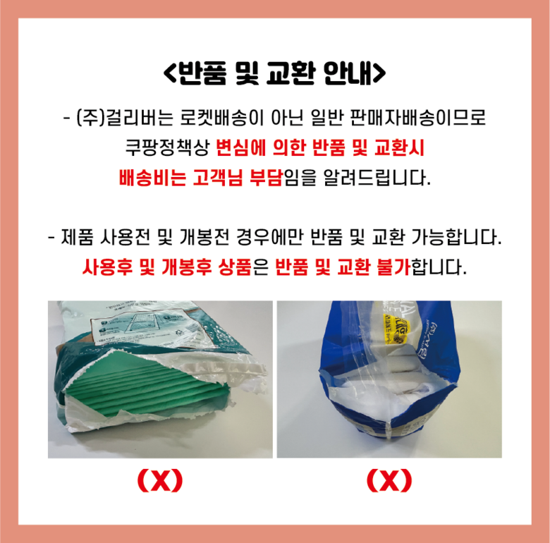 - ㆍ모니터 해상도의 차이로 인해 색상이나 이미지가 실제와 달라, 고객이 단순 변심으로 교환/반품을 무료로 요청하는 경우