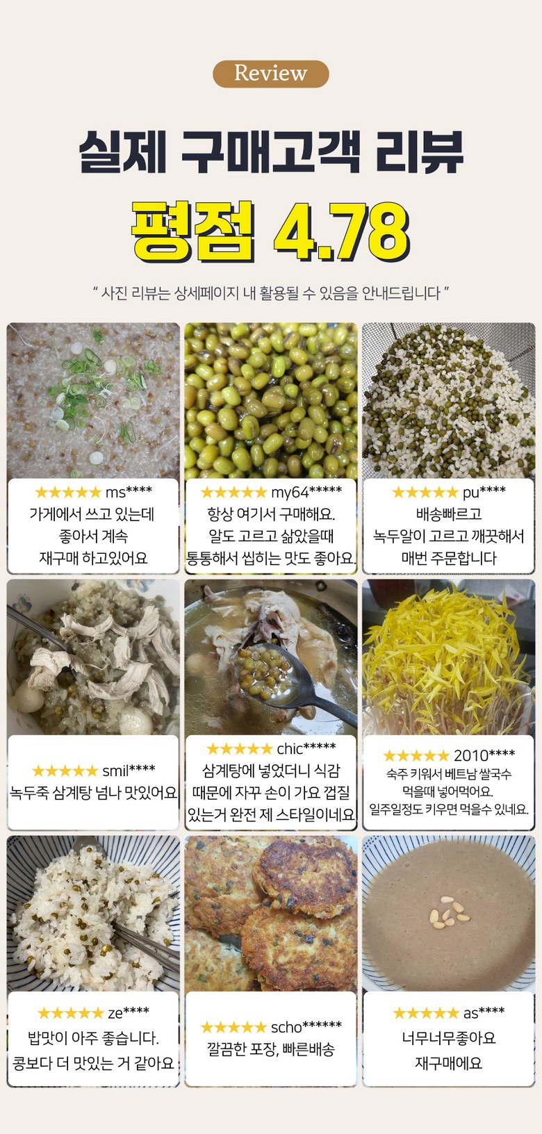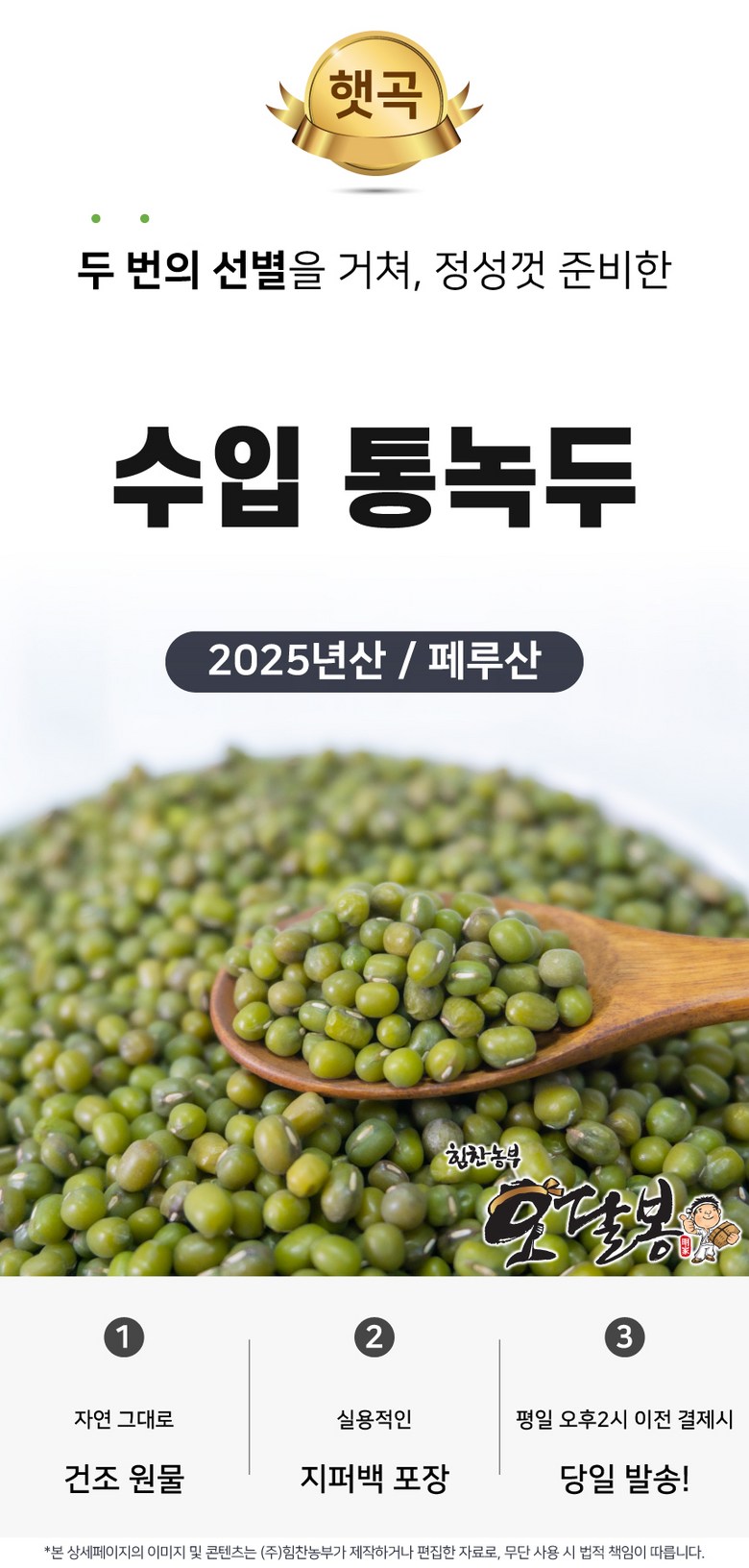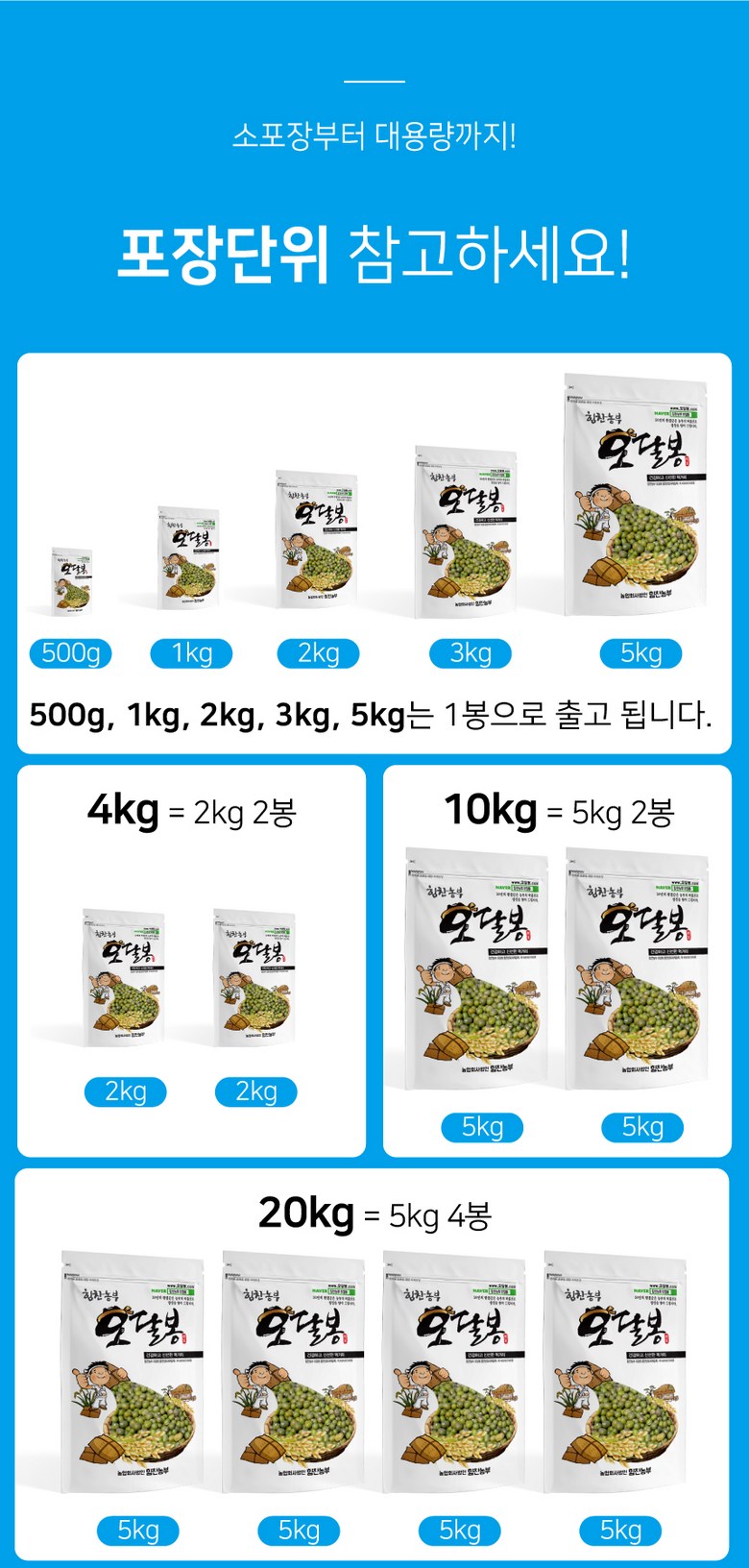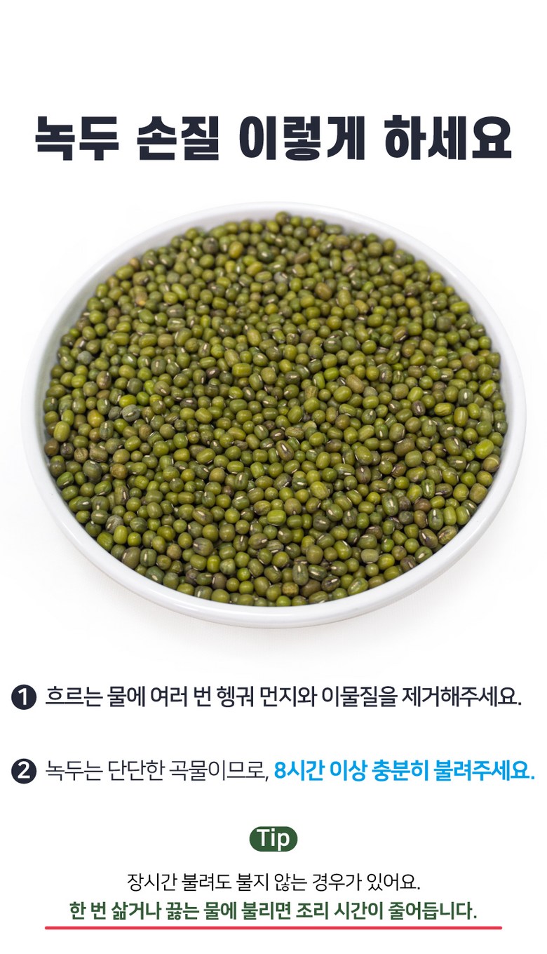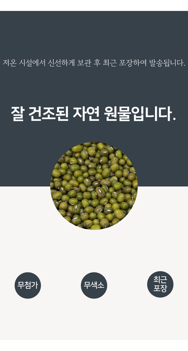 | 품목 또는 명칭 | 수입 통녹두 | 포장단위별 내용물의 용량(중량),수량,크기 | 500g 1kg 2kg 3kg 4kg(2kg+2kg) 5kg 10kg(5kg+5kg) 20kg(5kg*4개) |