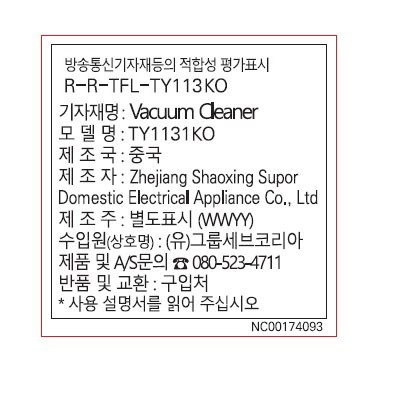 | 품명 및 모델명 | Vacuum Cleaner / TY1131KO | KC 인증정보 | 본품: R-R-TFL-TY113KO , 충전기 : HU07668-22006A, R-R-ZD4-ZD012M250080EK 전지: XU102247-23006A |