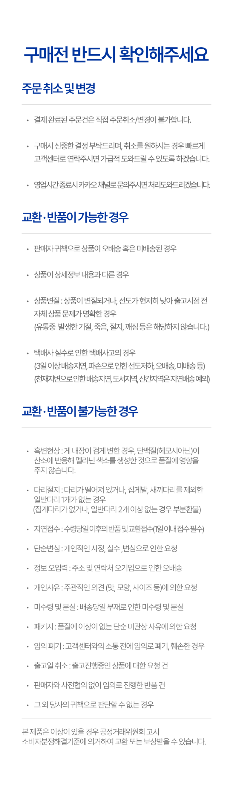 - ㆍ교환/반품에 관한 일반적인 사항은 판매자가 제시사항보다 관계법령이 우선합니다.