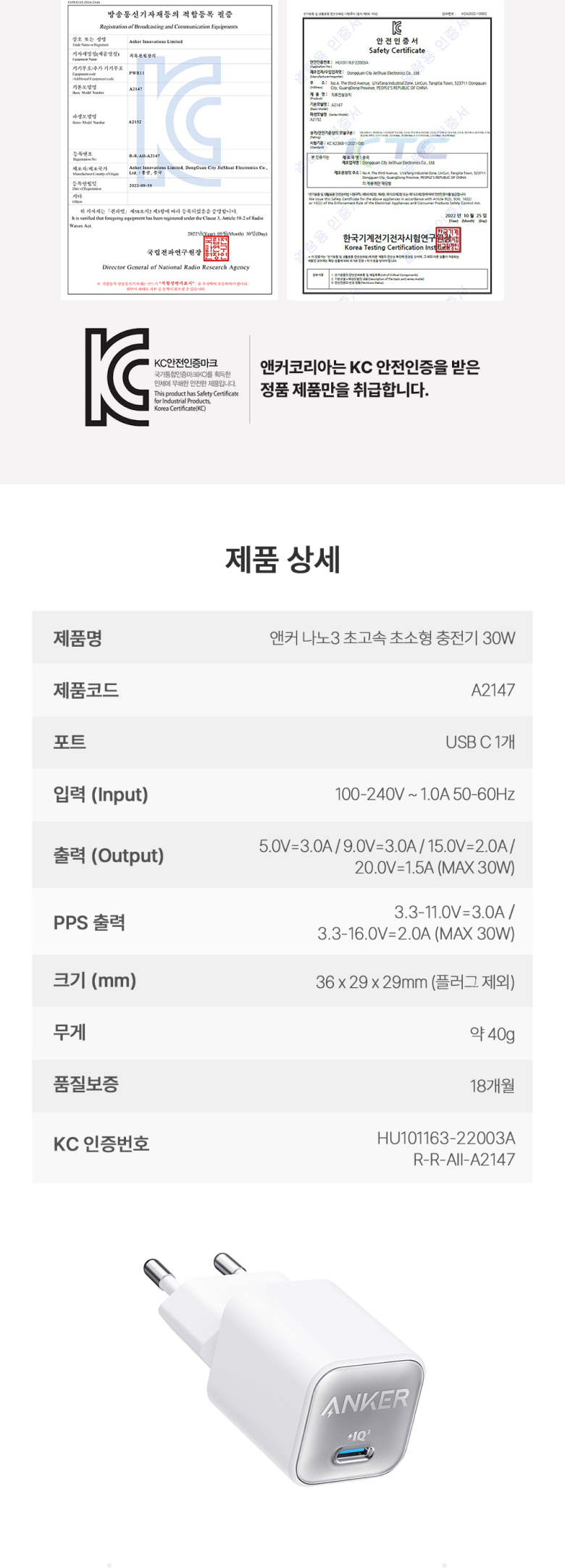 | 품명 및 모델명 | 앤커 나노3 30W 충전기 | KC 인증정보 | HU101163-22003A |