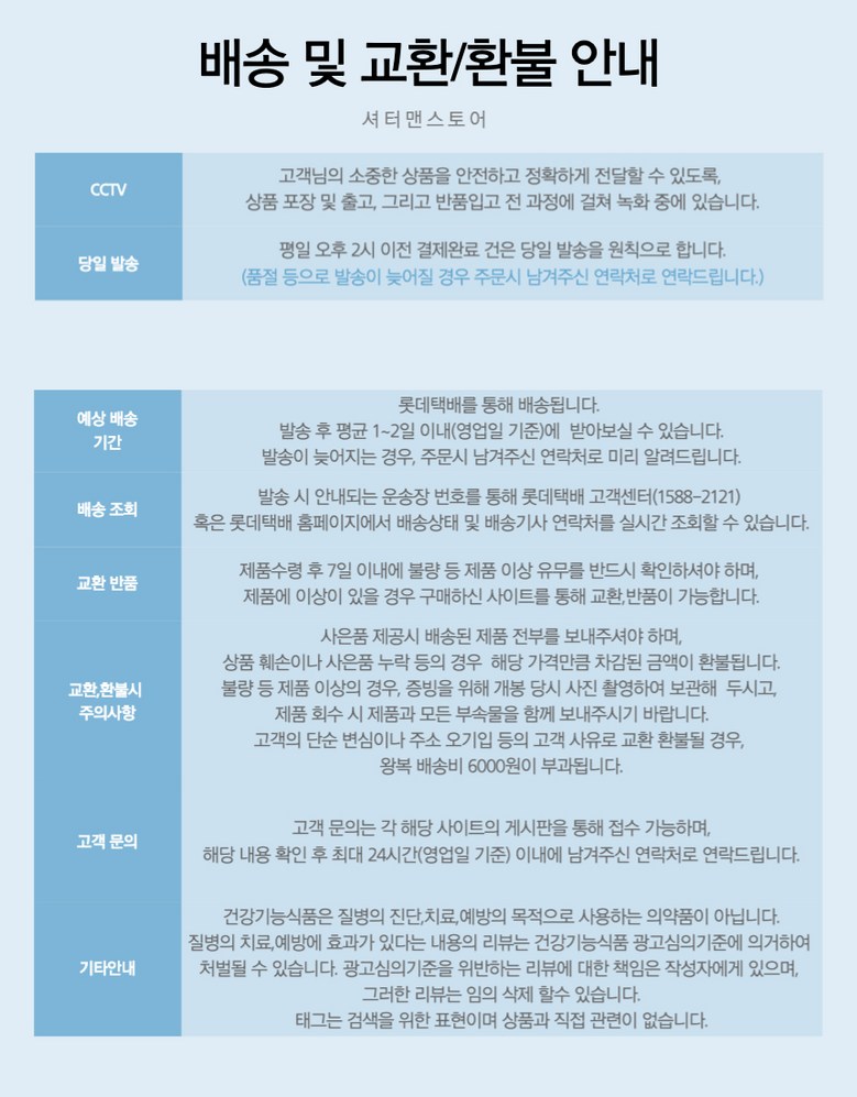 - ㆍ교환/반품에 관한 일반적인 사항은 판매자가 제시사항보다 관계법령이 우선합니다.