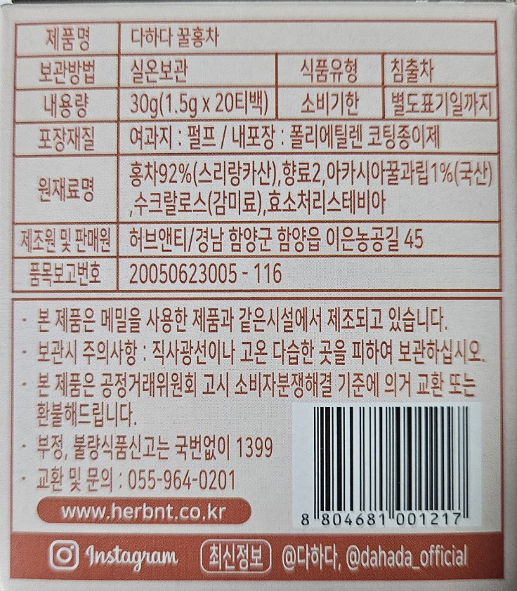 | 포장단위별 내용물의 용량(중량), 수량 | 1.5g x 20개입x 4개,1개 | 원재료명 및 함량 | 컨텐츠 참조 |