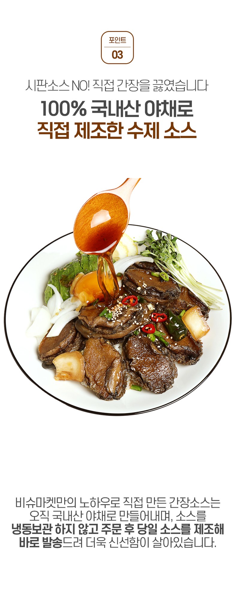 | 포장단위별 내용물의 용량(중량), 수량 | 1kg 1통 | 원재료명 및 함량 | 전복[국내산] 60%, 간장소스[국내산:간장, 정제수, 백설탕, 청량초, 대파, 무, 양파, 간마늘, 다시마, 유자, 청주, 매실원액] 40%, 감초[우즈벡], 구기자[중국산], 혼합간장[일본] |