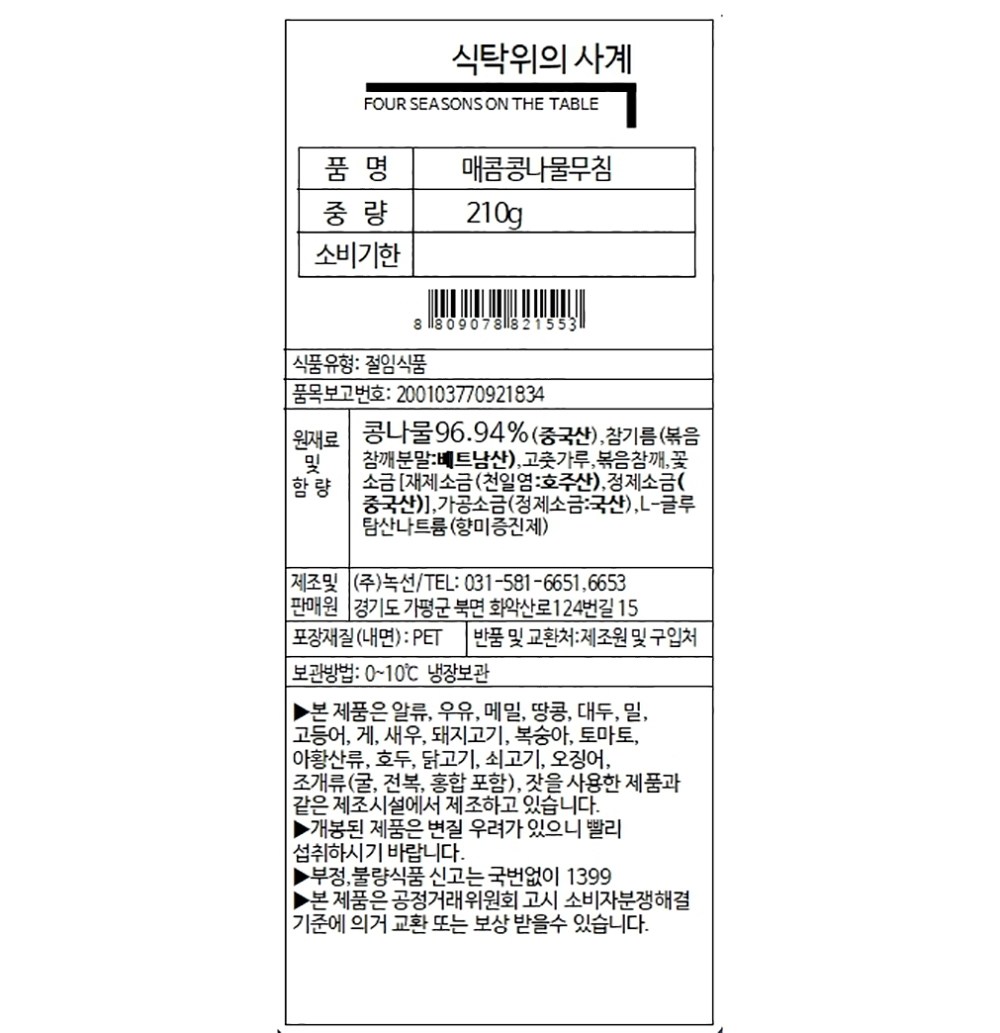 ‘식탁위의 사계’ 는 깊은 역사를 지닌 ‘녹선’의 프리미엄 제철 반찬 브랜드 입니다. 전 제품 식약처 HACCP 인증 시설에서 생산되어 출고 됩니다. 당일 생산 당일 출고를 원칙으로 하며, 안전하고 신선한 반찬을 제공하기 위해 최선을 다하고 있습니다.