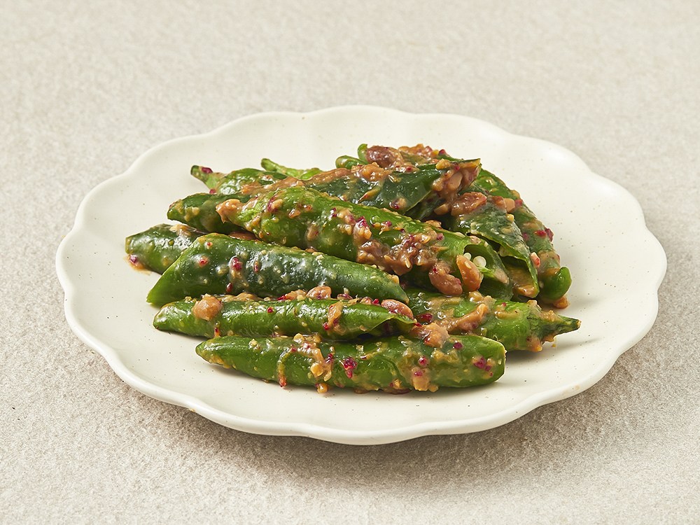 먹기 좋은 크기로 손질된 오이고추 된장무침이에요. 한입 먹으면 아삭하고 청량한 식감이 입맛을 사로잡죠. 짭조름하면서 구수한 감칠맛이 매력적이랍니다. 조리 없이 간편하게 식탁에 올려보세요. 밥에 얹어 먹어도 맛있고, 갈비나 불고기의 곁들임 반찬으로 활용해도 좋죠.