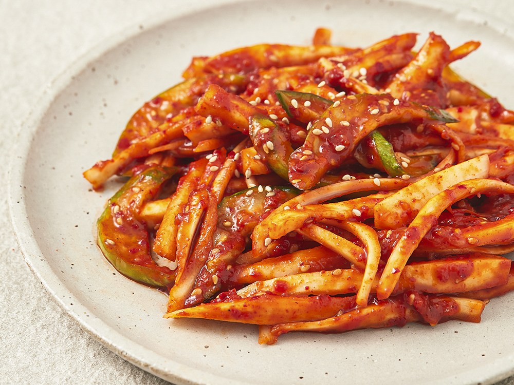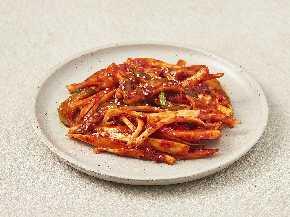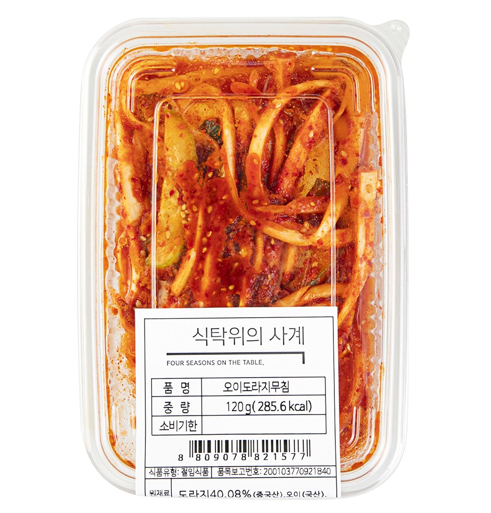 아삭하면서도 꼬들꼬들한 식감이 매력적인 오이도라지무침이에요. 향긋하고 매콤한 감칠맛으로 입맛을 사로잡지요. 씹을수록 은은하게 배어 나오는 달착지근한 풍미 또한 일품이랍니다. 재료를 손질하고 양념에 무칠 필요 없이, 간편하게 즐겨보세요.