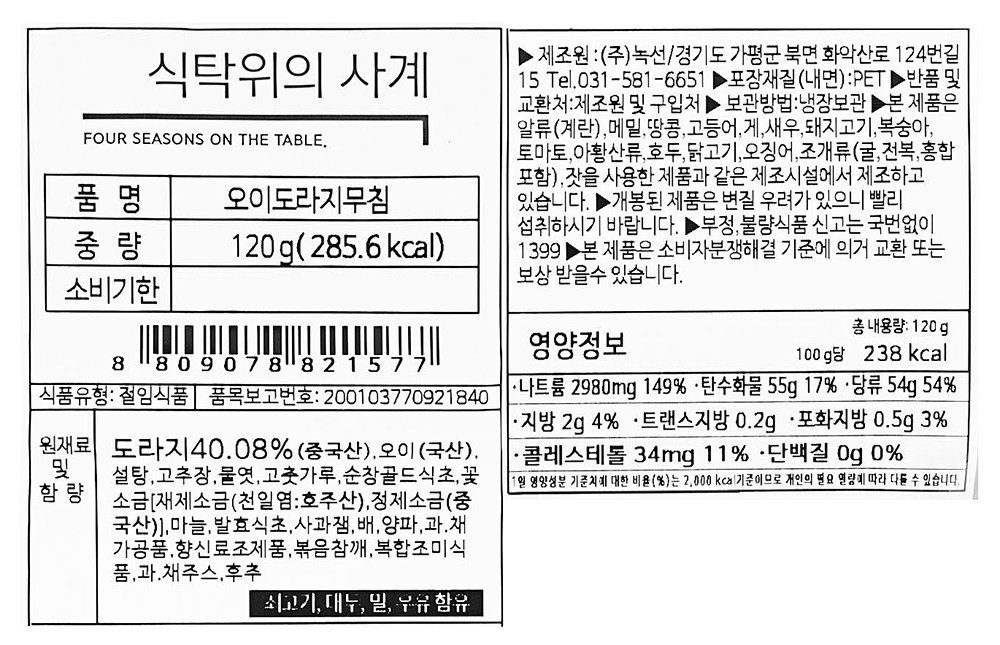 | 제품명 | 컨텐츠 참조 | 식품의 유형 | 컨텐츠 참조 |