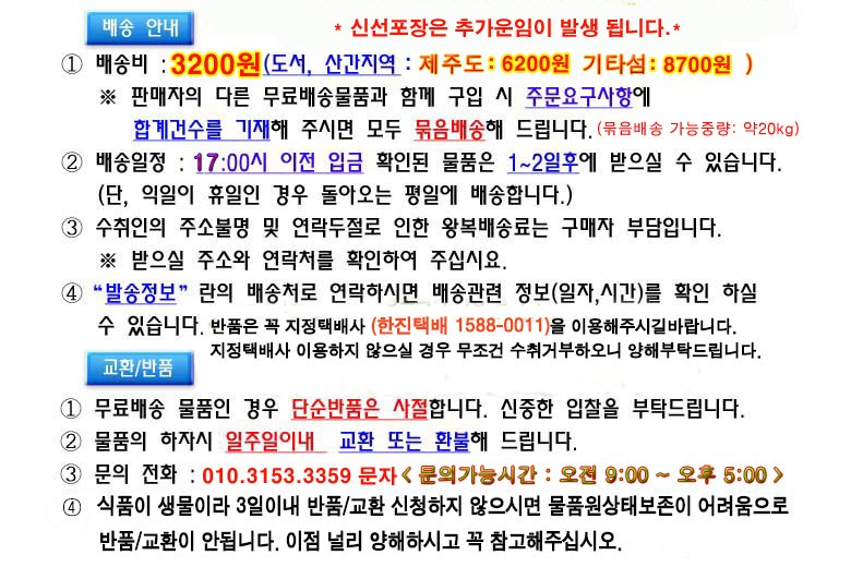 | 배송방법 | 순차배송 | 배송비 | 무료배송 · 도서산간 추가 배송비 - 제주 지역: 3,000원 - 도서산간 지역: 5,500원 |
