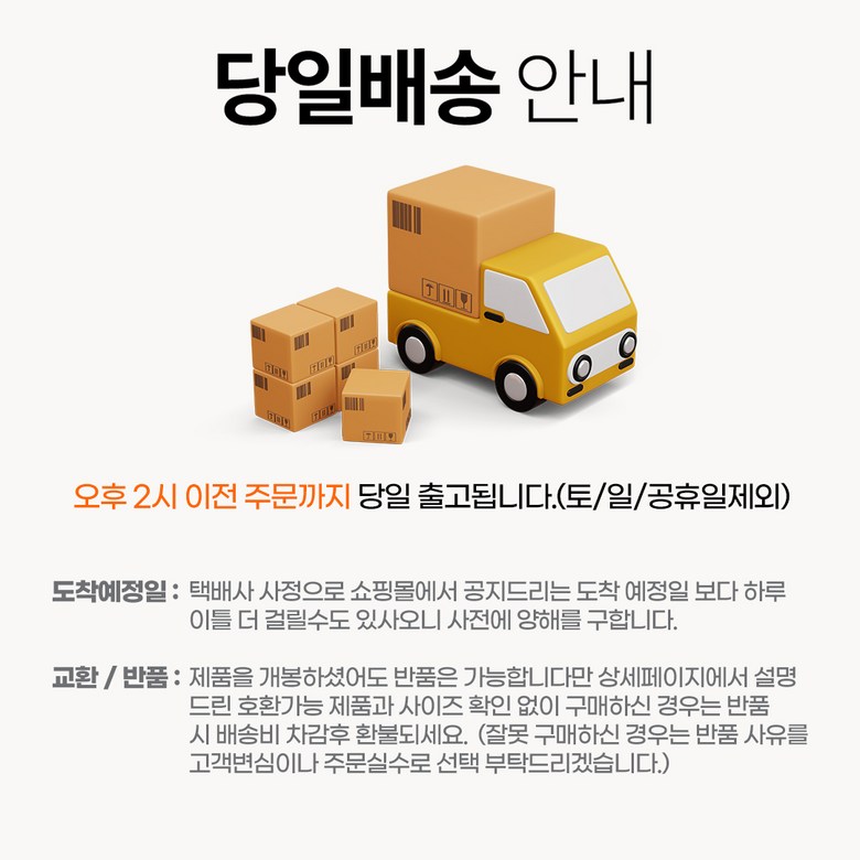 - ㆍ모니터 해상도의 차이로 인해 색상이나 이미지가 실제와 달라, 고객이 단순 변심으로 교환/반품을 무료로 요청하는 경우