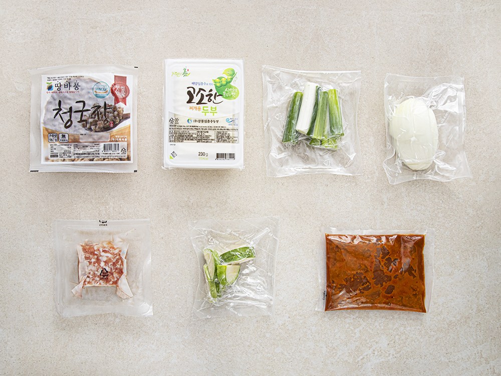 청국장, 두부, 대파, 양파, 돼지고기, 애호박, 된장찌개용 소스로 구성되어 있습니다.