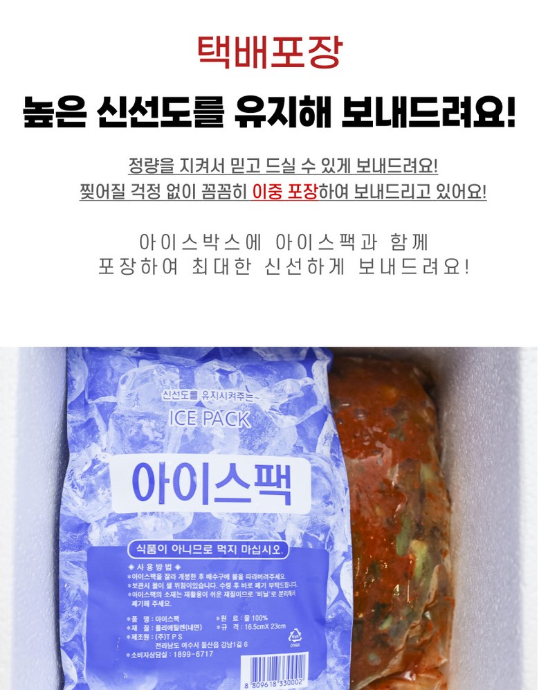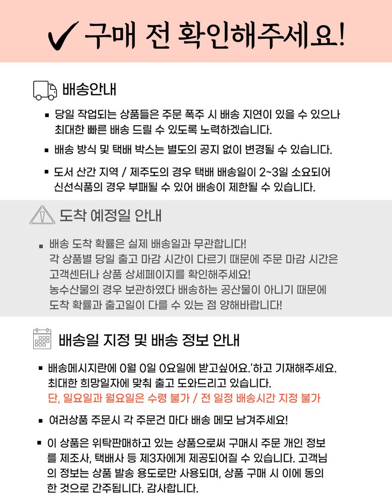 | 배송방법 | 신선/냉장/냉동 | 배송비 | 무료배송 · 도서산간 추가 배송비 - 제주 지역: 5,000원 - 도서산간 지역: 8,000원 |
