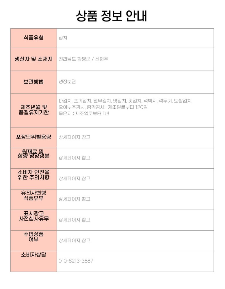 | 제조연월일, 소비기한 또는 품질유지기한 | 상품 상세페이지 참조 | 세부 품목군별 표시사항 | 상품 상세페이지 참조 |