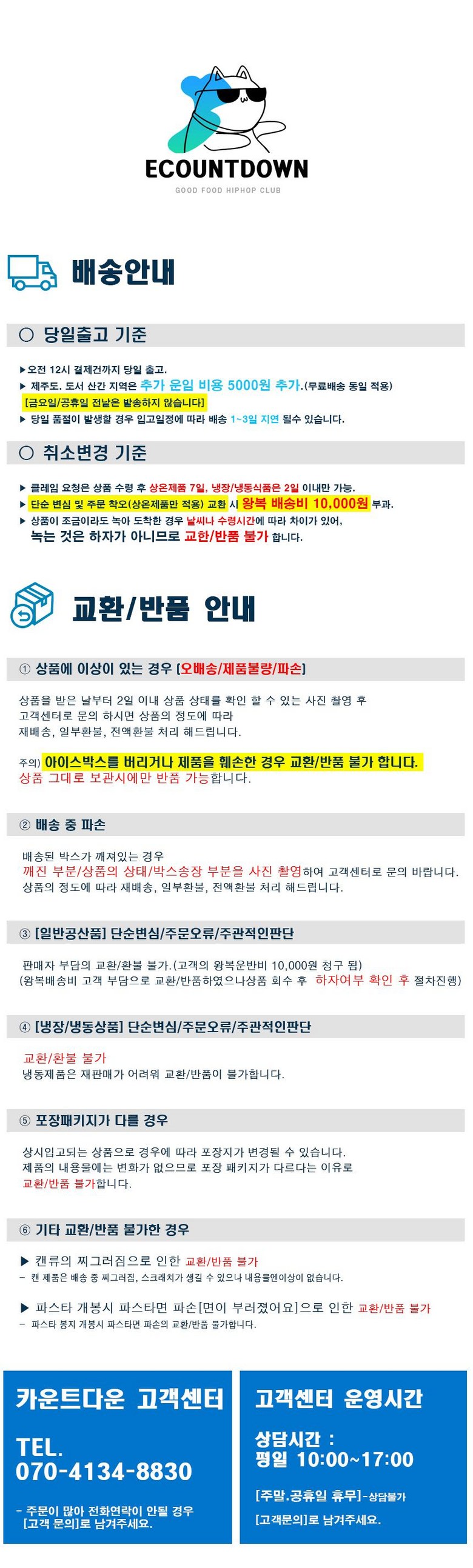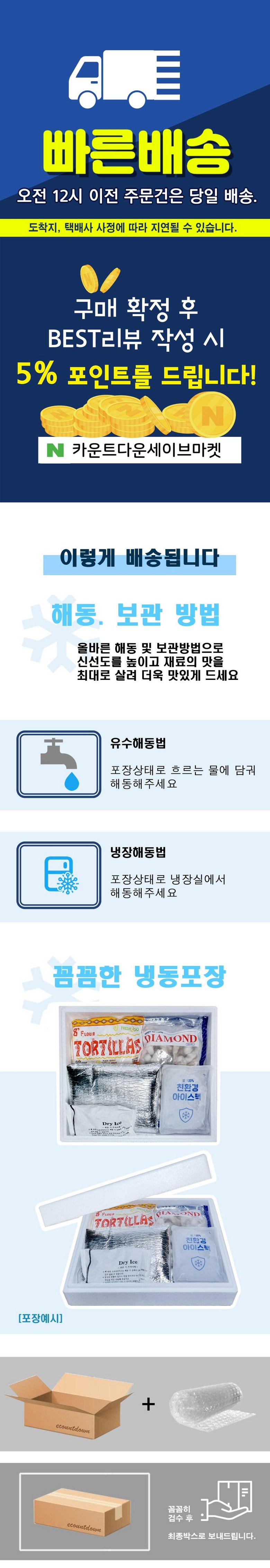 | 배송방법 | 신선/냉장/냉동 | 배송비 | 무료배송 · 도서산간 추가 배송비 - 제주 지역: 5,000원 - 도서산간 지역: 5,000원 |