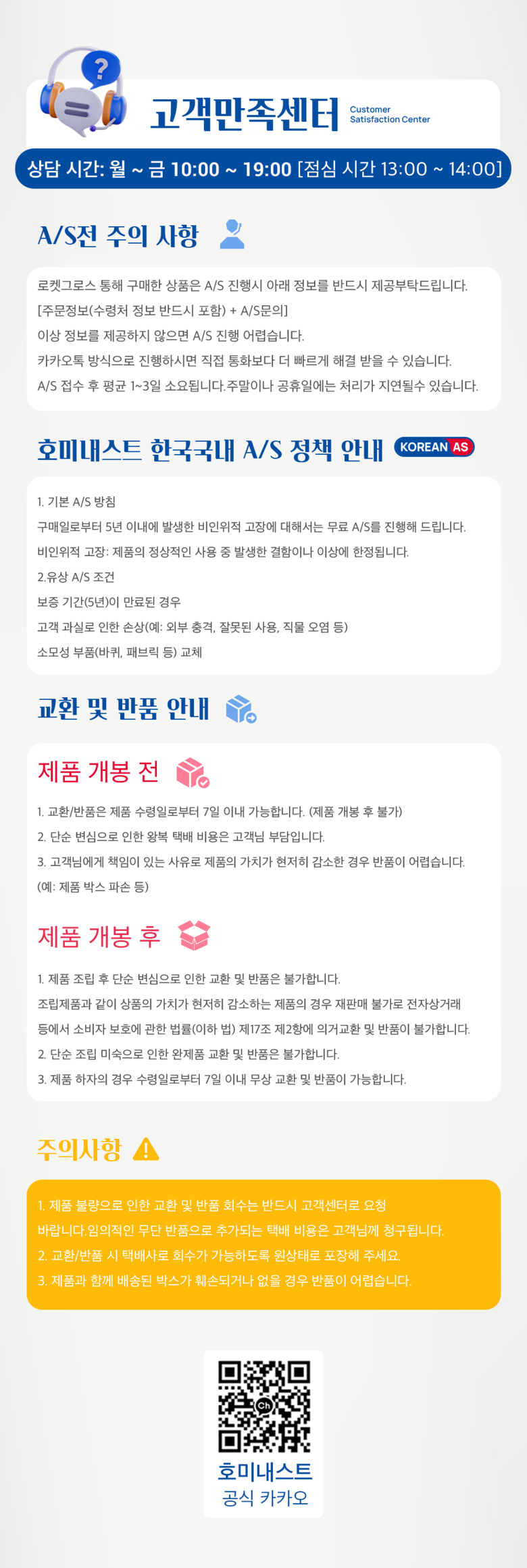 | 소비자상담 관련 전화번호 | 카카오체늘→"호미네스트"검색→체팅상담(우선 처리)A/S 상담 번호:010-4377-3791 | ||