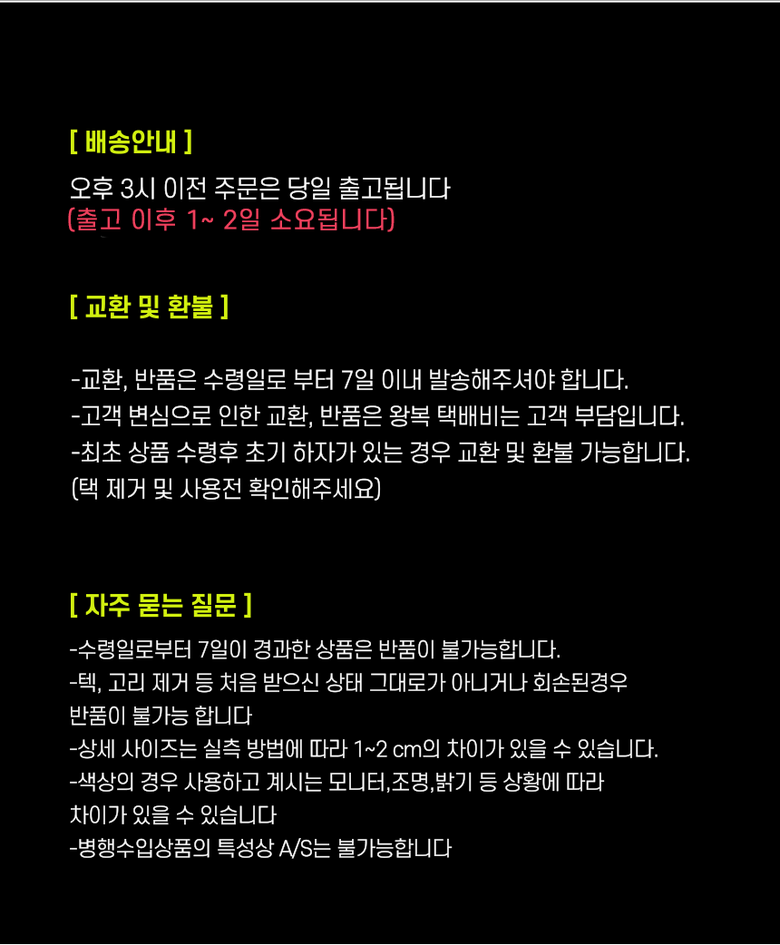 - ㆍ모니터 해상도의 차이로 인해 색상이나 이미지가 실제와 달라, 고객이 단순 변심으로 교환/반품을 무료로 요청하는 경우