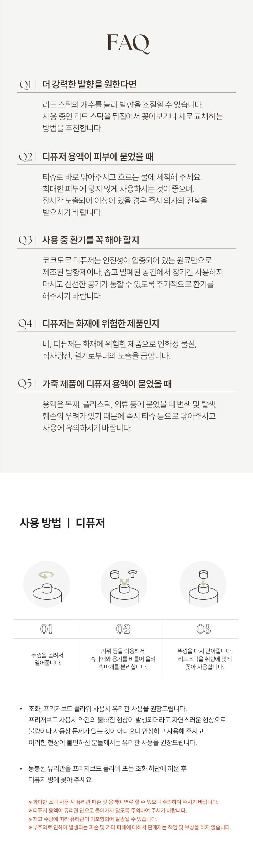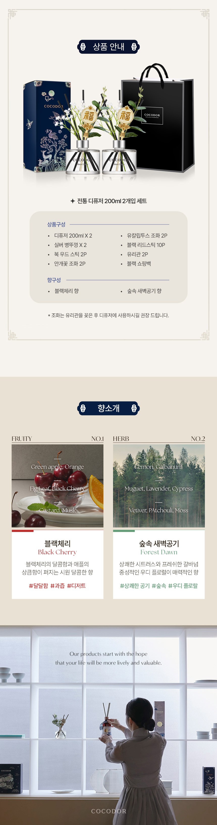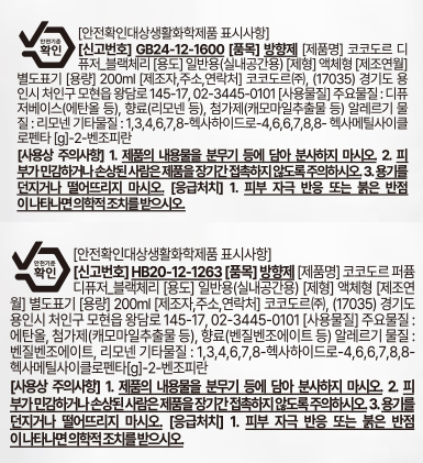 | 품목 및 제품명 | 방향제/ 코코도르 퍼퓸 디퓨저_블랙체리, 코코도르 디퓨저_블랙체리 | 용도(표백제의 경우 계열을 함께표시) 및 제형 | 일반용(실내공간용)/액체형 |