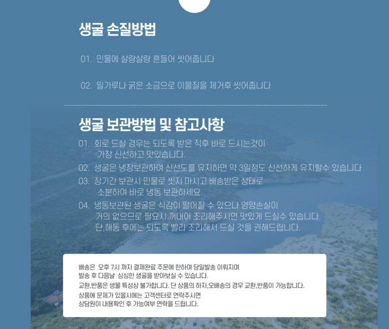 | 제조연월일, 소비기한 또는 품질유지기한 | 생물로써 받으신후 가능한 빨리 섭취하시고 2~3일 이내 섭취 하십시요 | 세부 품목군별 표시사항 | 해당사항없음 |