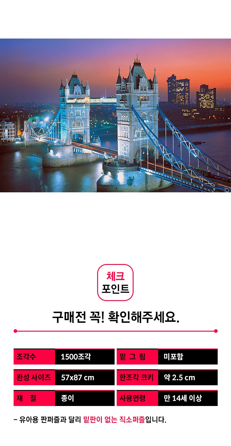 | 품명 및 모델명 | 타워 브릿지 런던 1500피스 직소퍼즐 [TMX-150-021] | 인증/허가 사항 | 해당 없음 (만 14세 이상) |