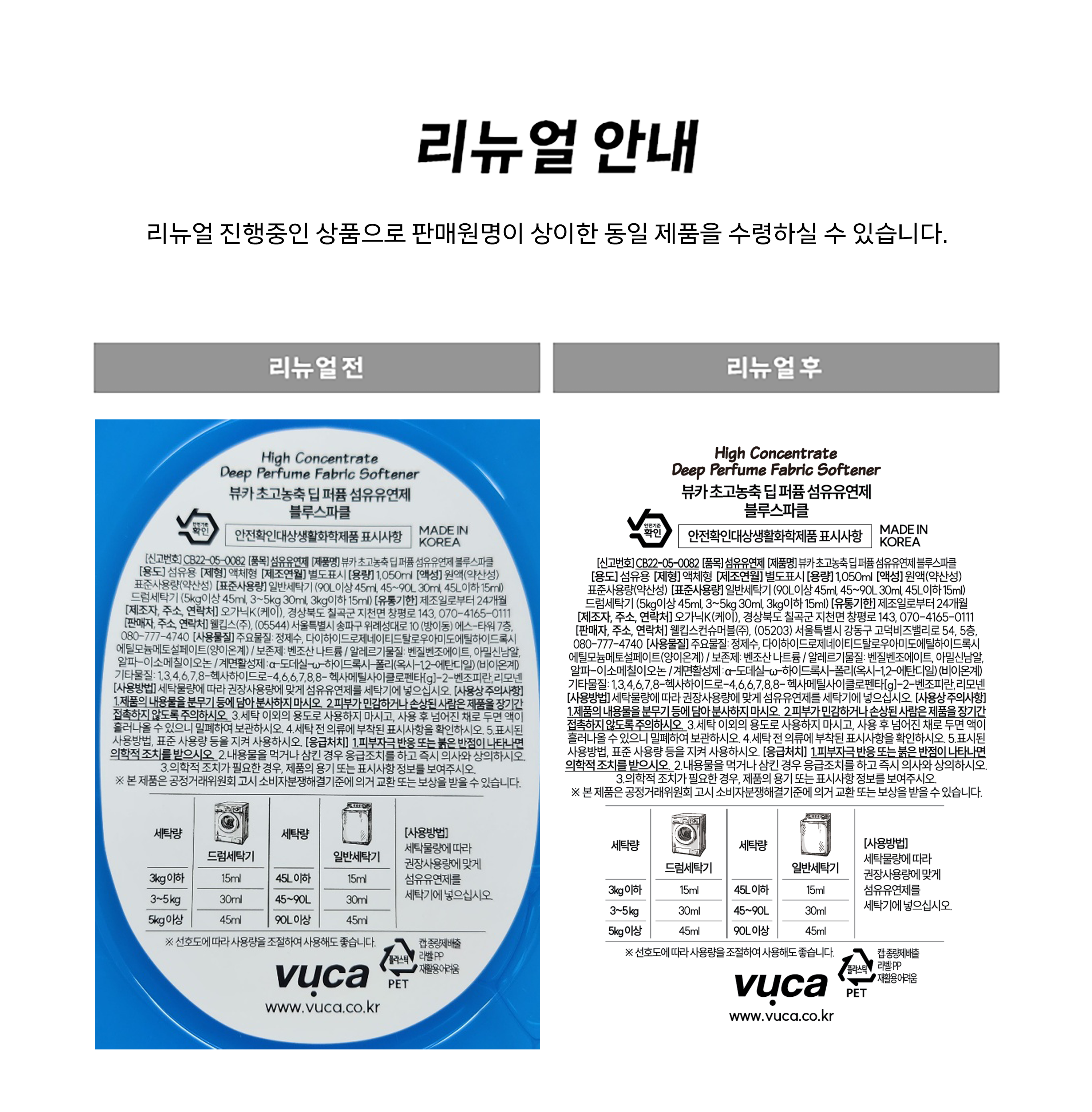 | 품목 및 제품명 | 섬유유연제 / 뷰카 초고농축 딥 퍼퓸 섬유유연제 블루스파클 | 용도(표백제의 경우 계열을 함께표시) 및 제형 | 섬유용 / 액체형 |