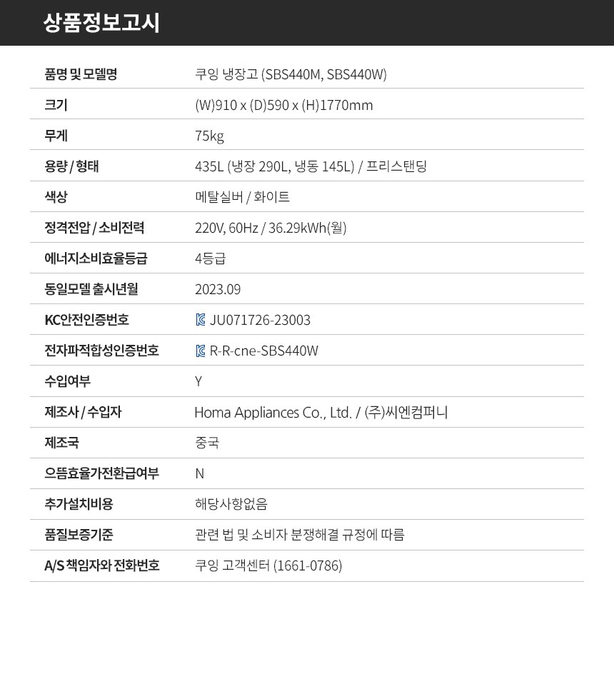 | 품명 및 모델명 | 전기냉장냉동기기(전기냉장고) / SBS440M | KC 인증정보 | JU071726-23003 /R-R-cne-SBS440W |