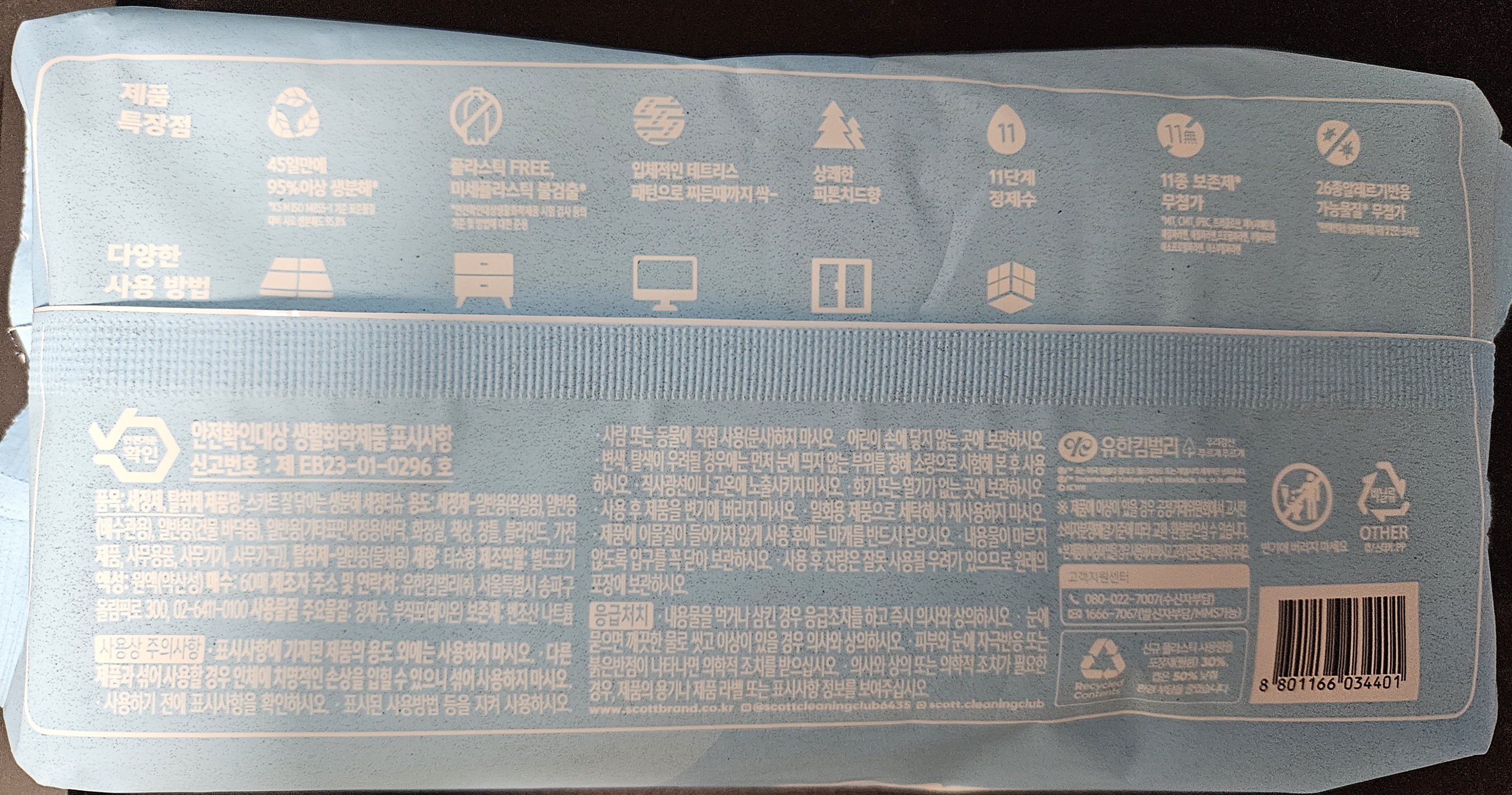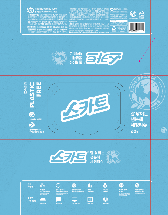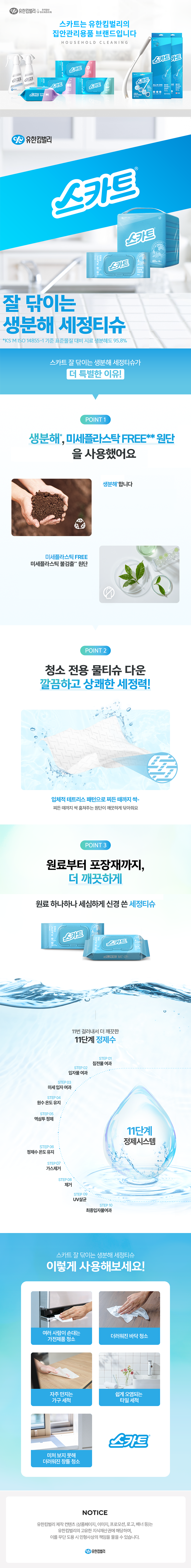 | 품목 및 제품명 | 세정제,탈취제 / 스카트 잘 닦이는 생분해 세정티슈 | 용도(표백제의 경우 계열을 함께표시) 및 제형 | 일반용-욕실용,일반용-배수관용,일반용-건물 바닥용,일반용-기타표면세정용-바닥,화장실,책상,창틀,블라인드,가전제품,사무용품,사무기기,사무가구,일반용-물체용 / 비분사형-티슈형 |
