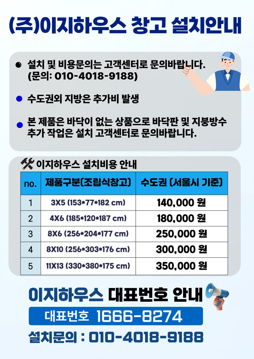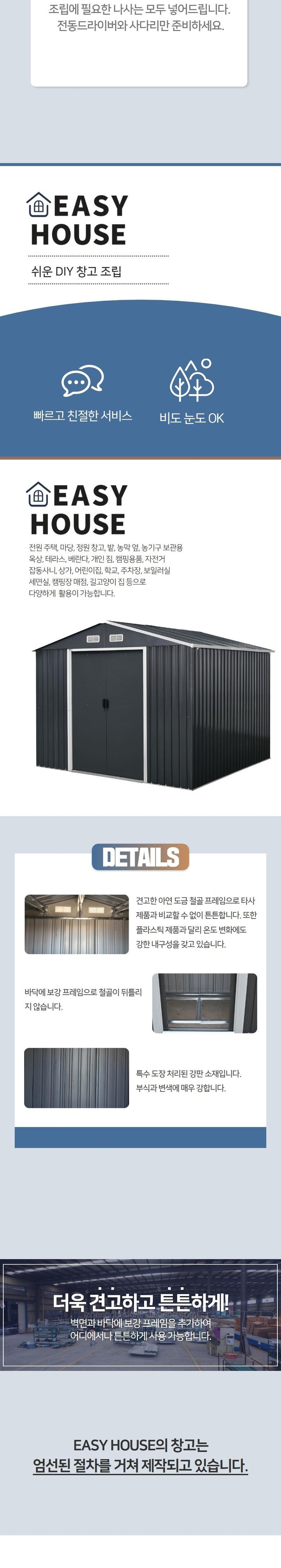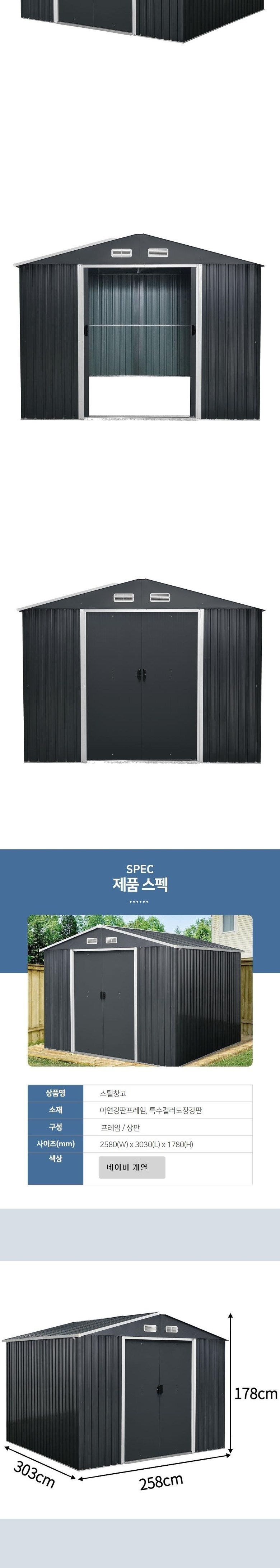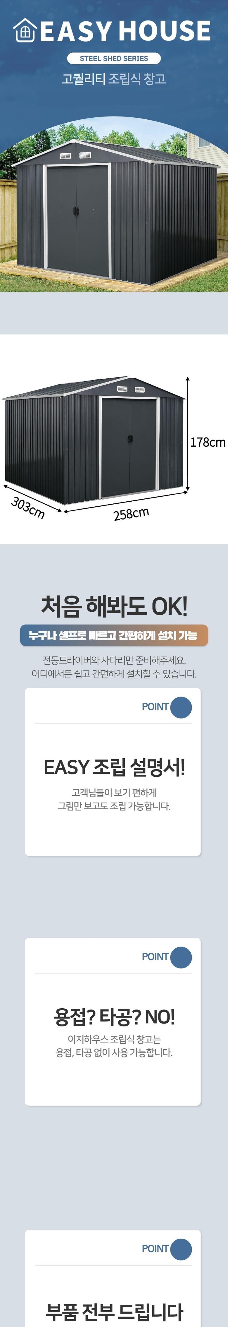| 품명 | 이지하우스 조립식 스틸창고 258 x 303 x 178cm 고객직접설치 | KC 인증정보 | 해당없음 |