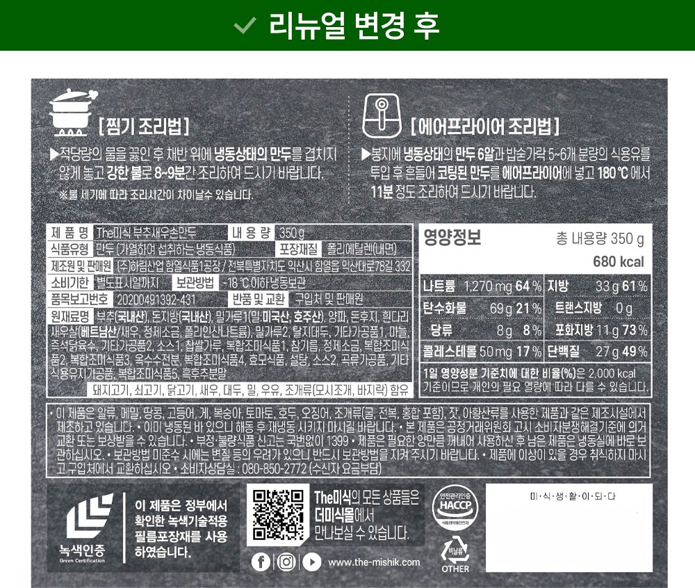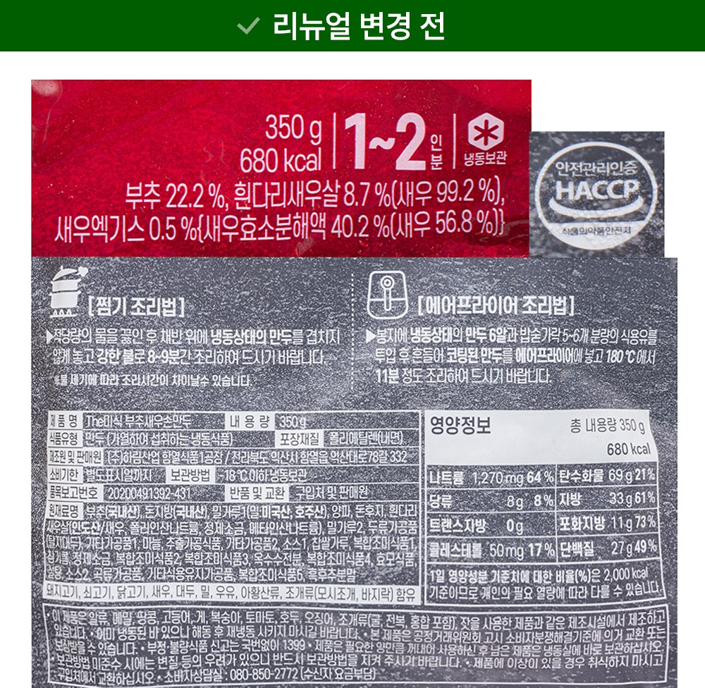 | 포장단위별 내용물의 용량(중량), 수량 | 350g*2개 | 원재료명 및 함량 | 컨텐츠 참조 |