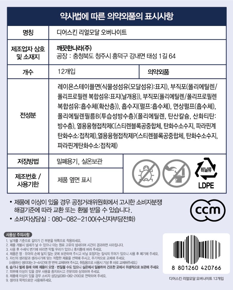 | 품명 및 모델명 | 디어스킨 리얼모달 오버나이트 | 인증/허가 사항 | 의약외품 |