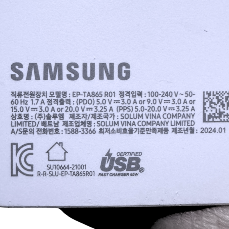 | 품명 및 모델명 | 삼성전자 초고속 충전기 65W 접지형 EP-TA865 R01 | KC 인증정보 | R-R-SLU-EP-TA865R01 |