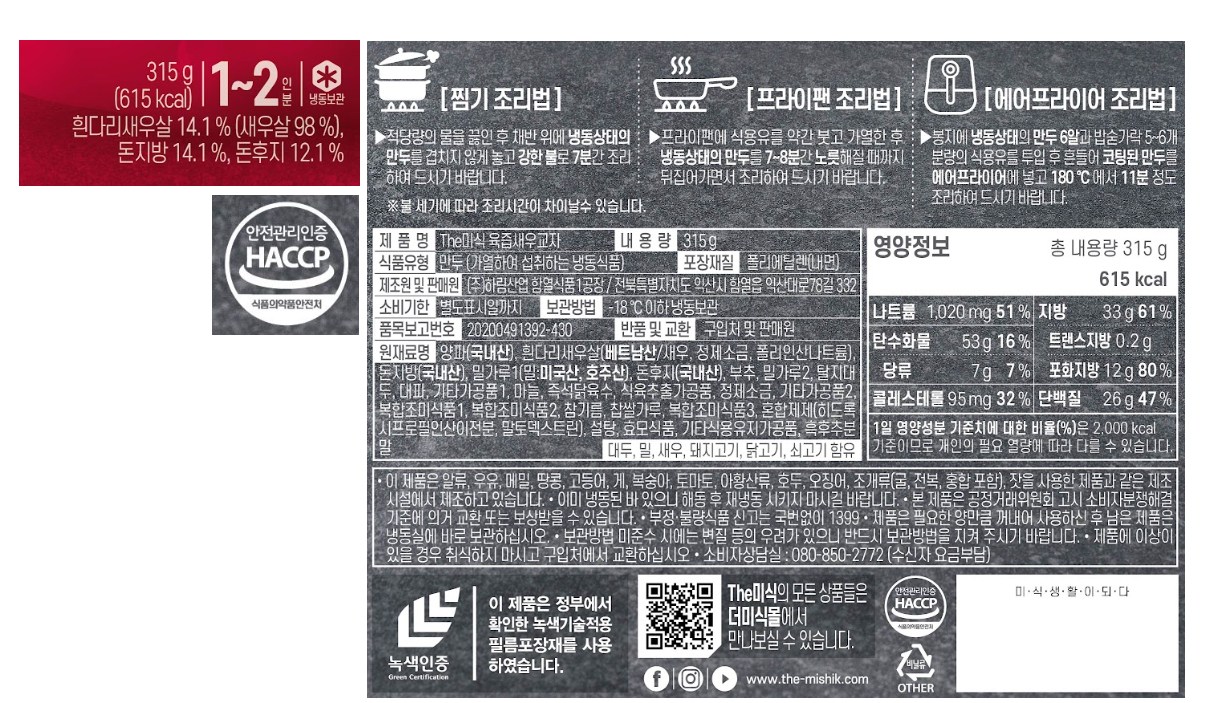 | 포장단위별 내용물의 용량(중량), 수량 | 315g x 4개 | 원재료명 및 함량 | 컨텐츠 참조 |
