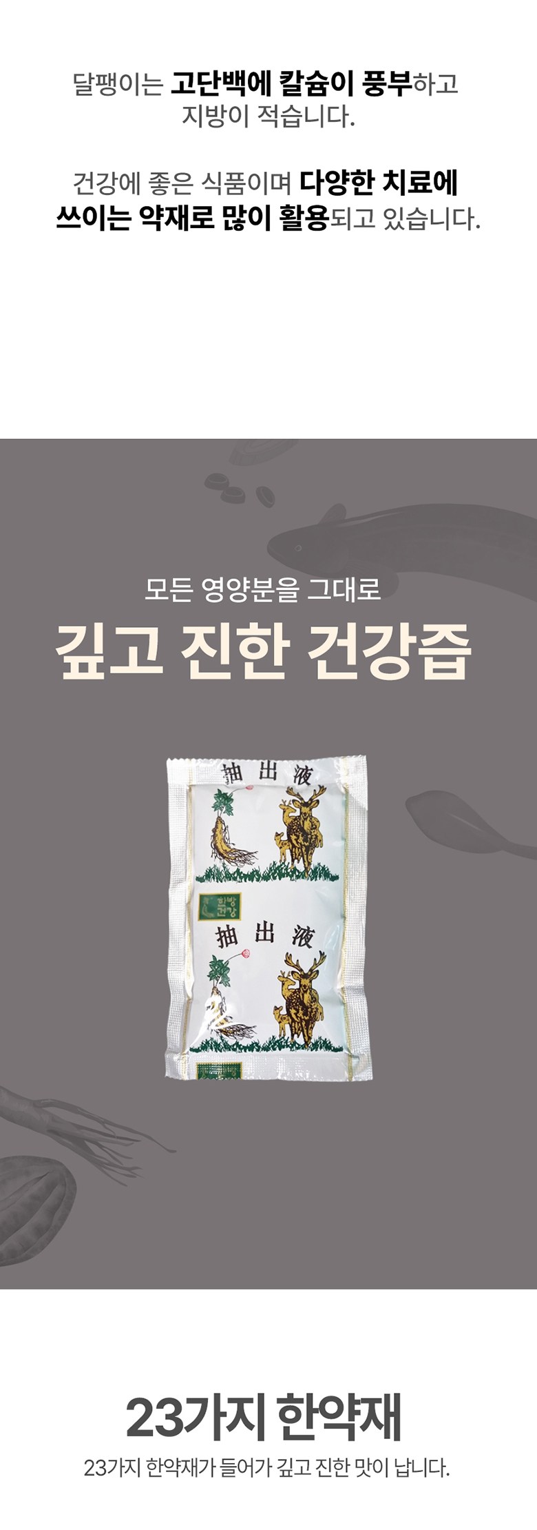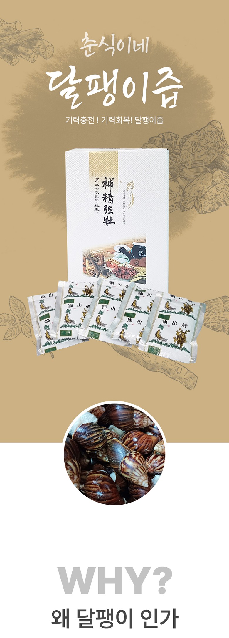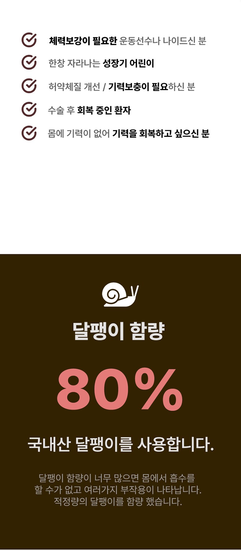 | 품목 또는 명칭 | 달팽이엑기스 | 포장단위별 내용물의 용량(중량),수량,크기 | 1포100ml60포 가로25세로30 |