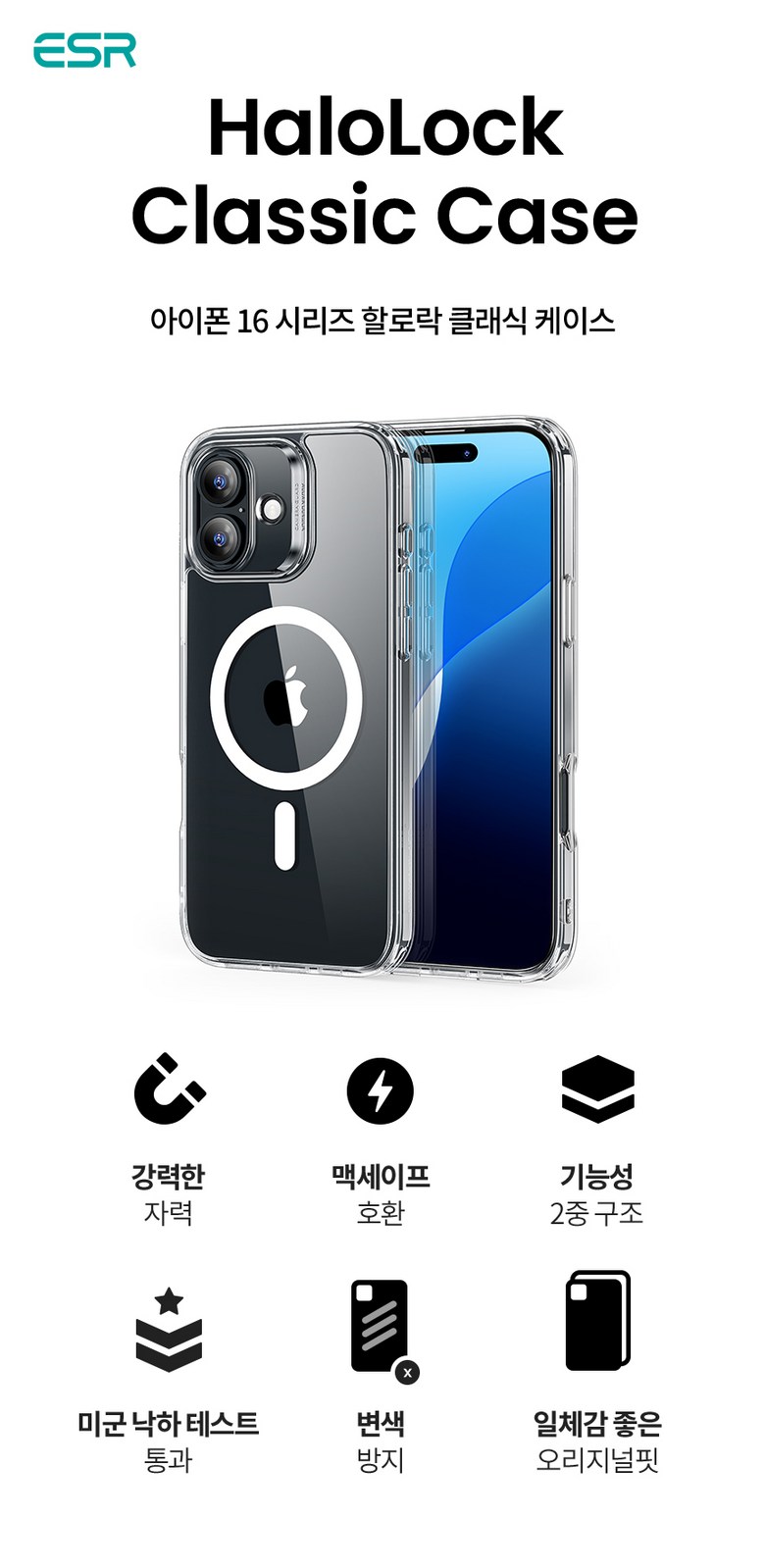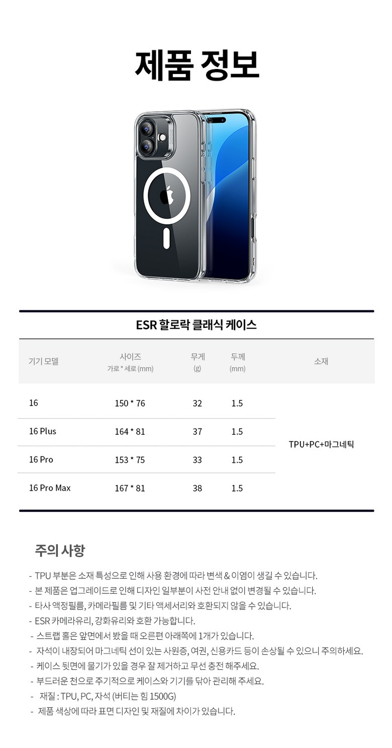 | 품명 및 모델명 | ESR 아이폰 16 Pro Max 할로락 클래식 케이스 | 인증/허가 사항 | 상품 상세페이지 참조 |
