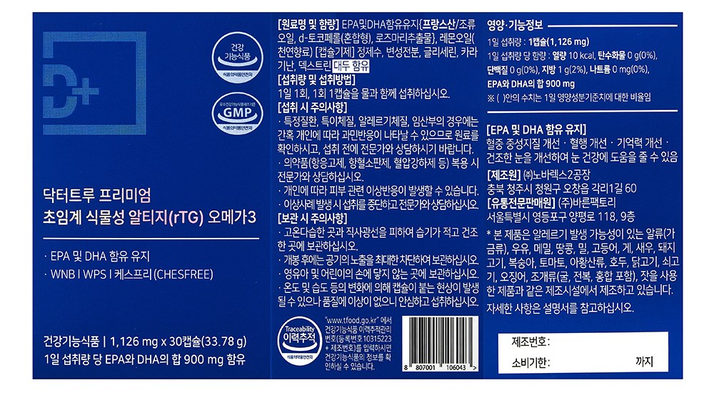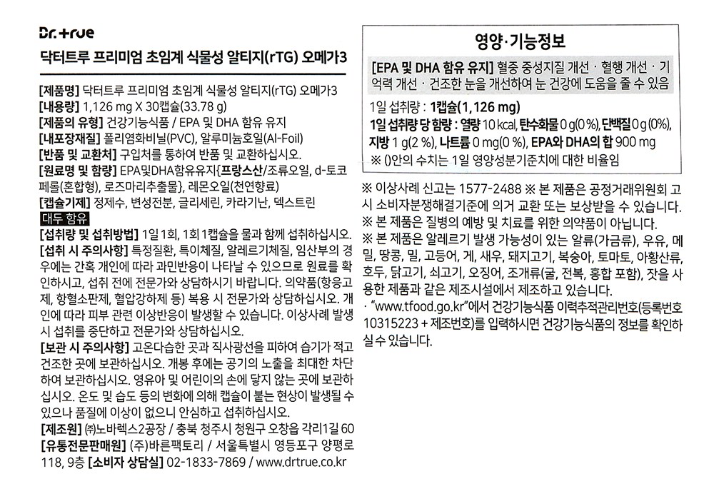| 제품명 | 닥터트루 프리미엄 초임계 식물성 알티지(rTG) 오메가3 | 제조업소의 명칭과 소재지 | 컨텐츠참조 |
