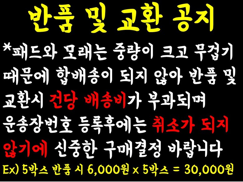 - ㆍ모니터 해상도의 차이로 인해 색상이나 이미지가 실제와 달라, 고객이 단순 변심으로 교환/반품을 무료로 요청하는 경우
