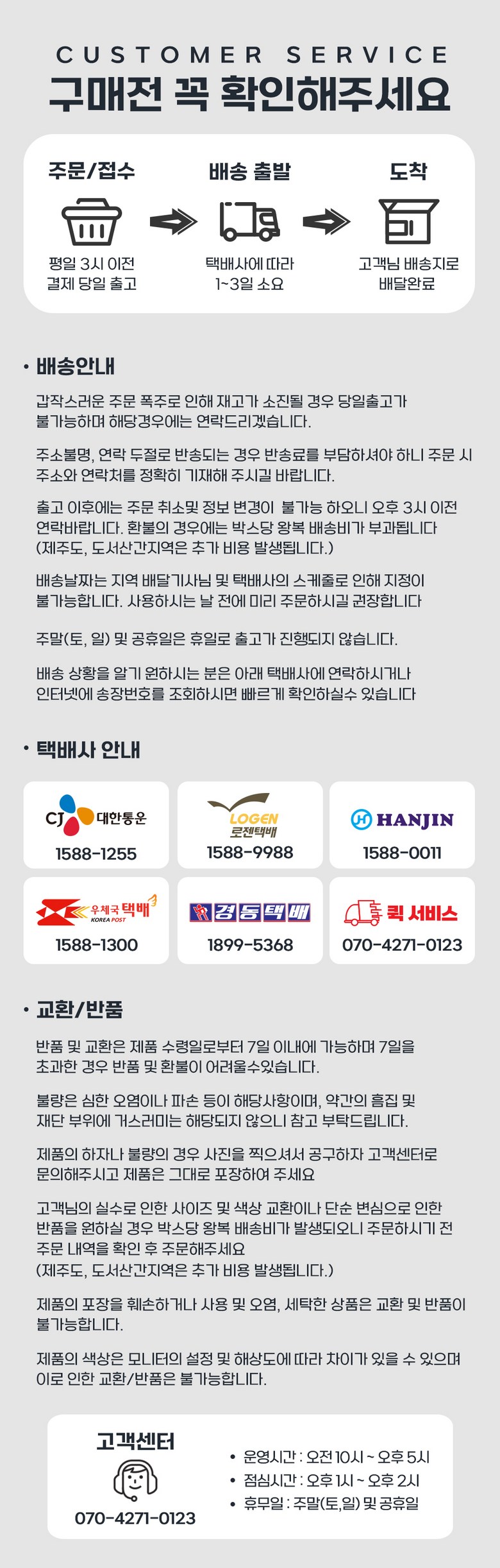 - ㆍ교환/반품에 관한 일반적인 사항은 판매자가 제시사항보다 관계법령이 우선합니다.