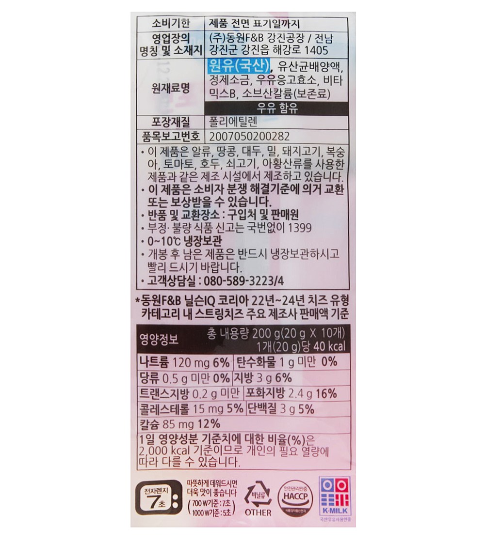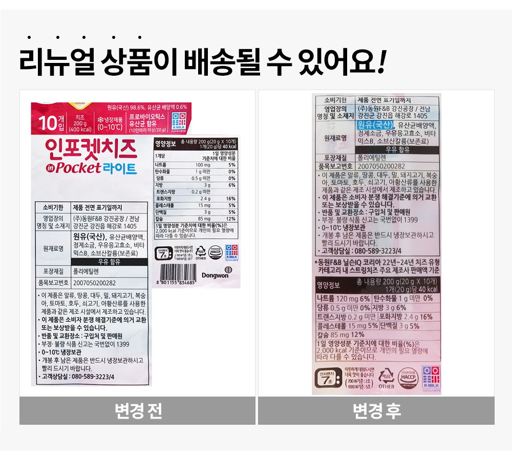 | 제품명 | 인포켓치즈 라이트 | 식품의 유형 | 자연치즈 |
