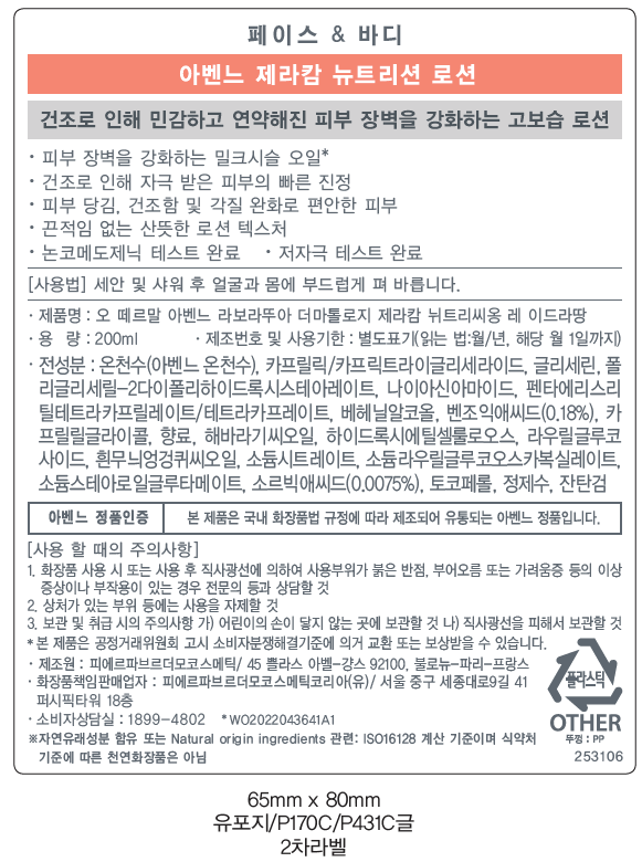 | 화장품제조업자, 화장품책임판매업자 및 맞춤형화장품판매업자 | 컨텐츠 참조/피에르파브르더모코스메틱코리아(유) | 제조국 | 프랑스 |